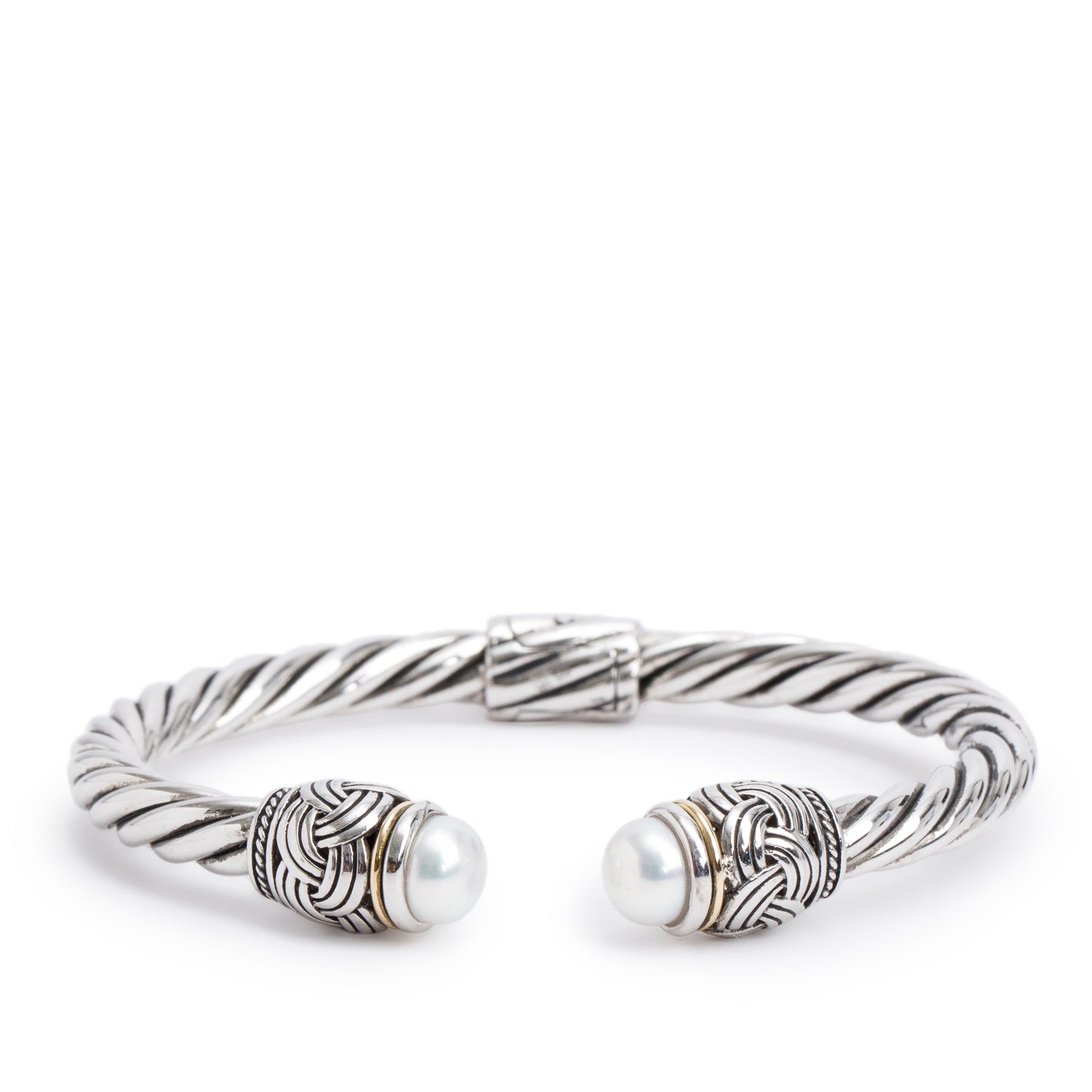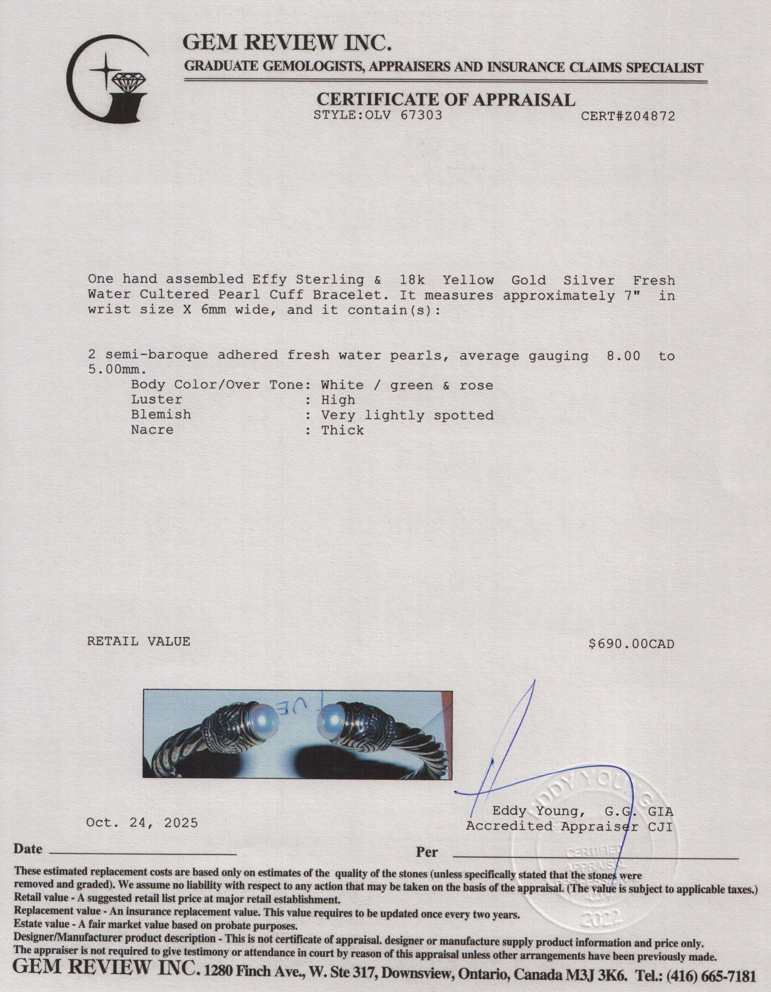 Effy Sterling & 18k Yellow Gold Silver Fresh Water Cultered Pearl Cuff Bracelet