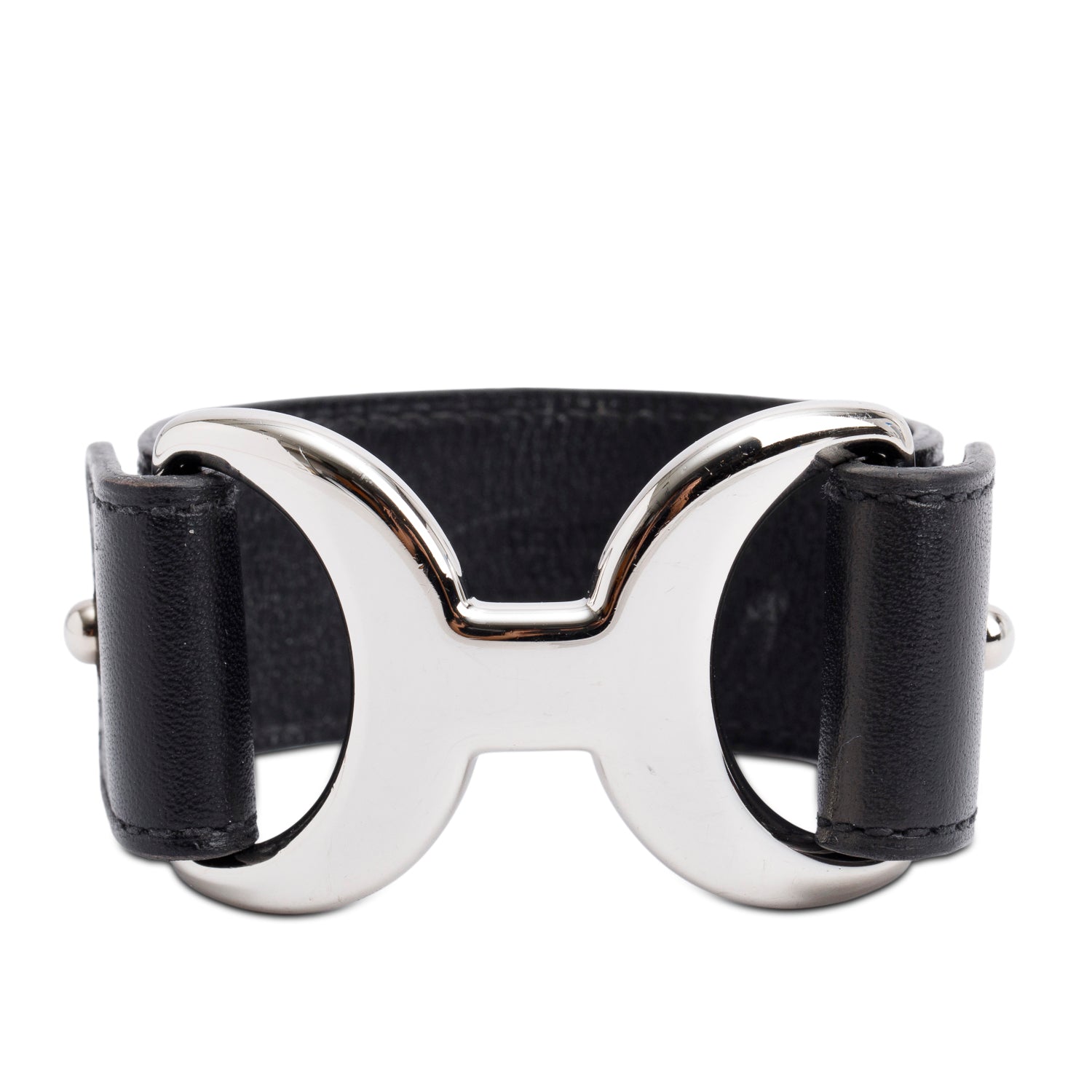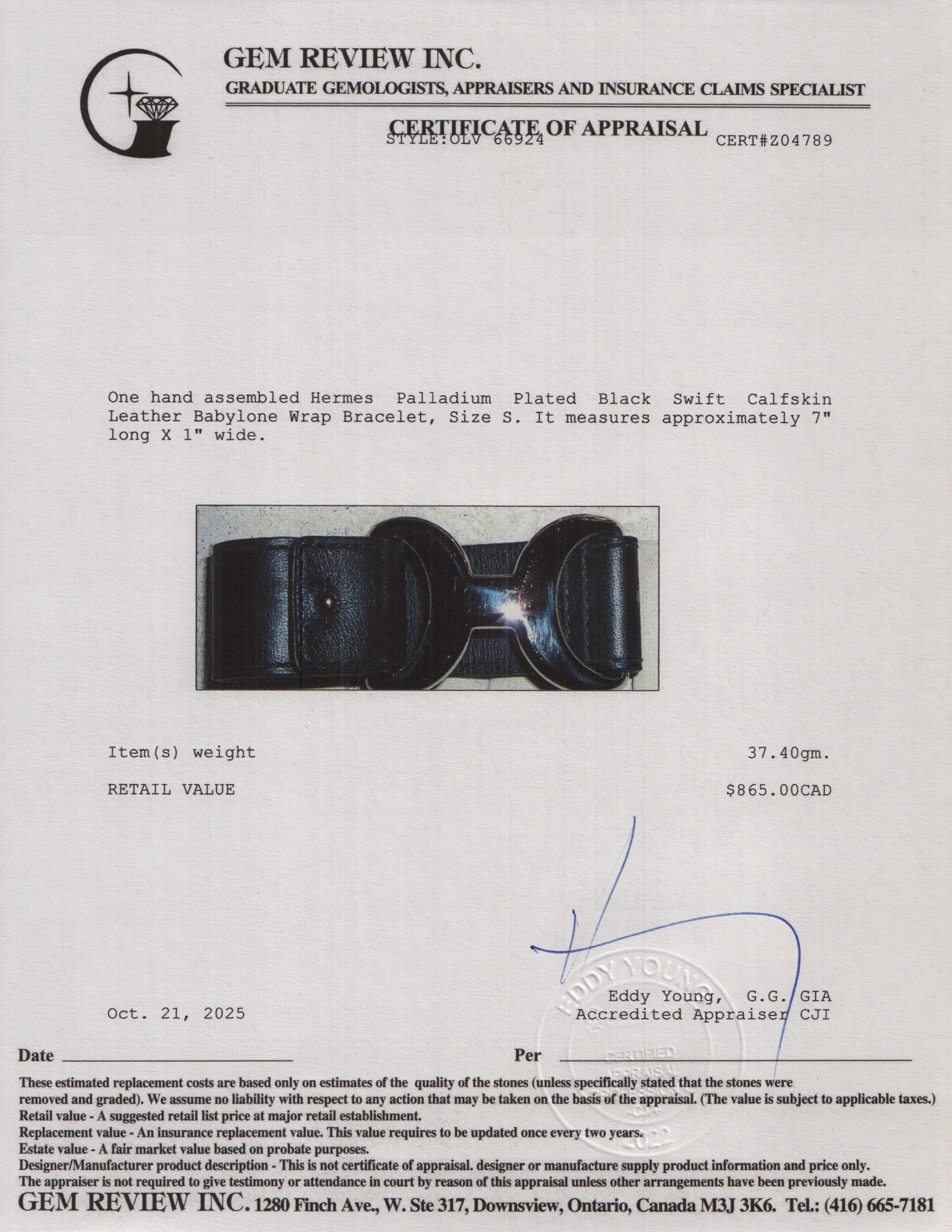 Palladium Plated Black Swift Calfskin Leather Babylone Wrap Bracelet, Size S