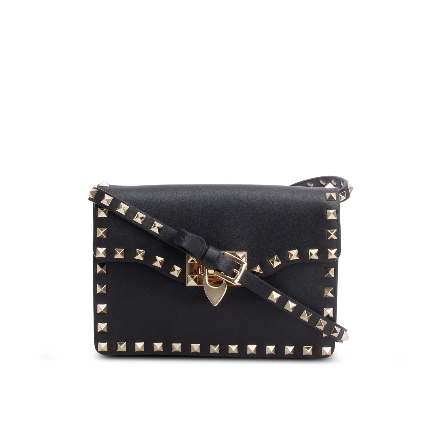 Black Vitello Calfskin Leather Rockstud Crossbody Bag