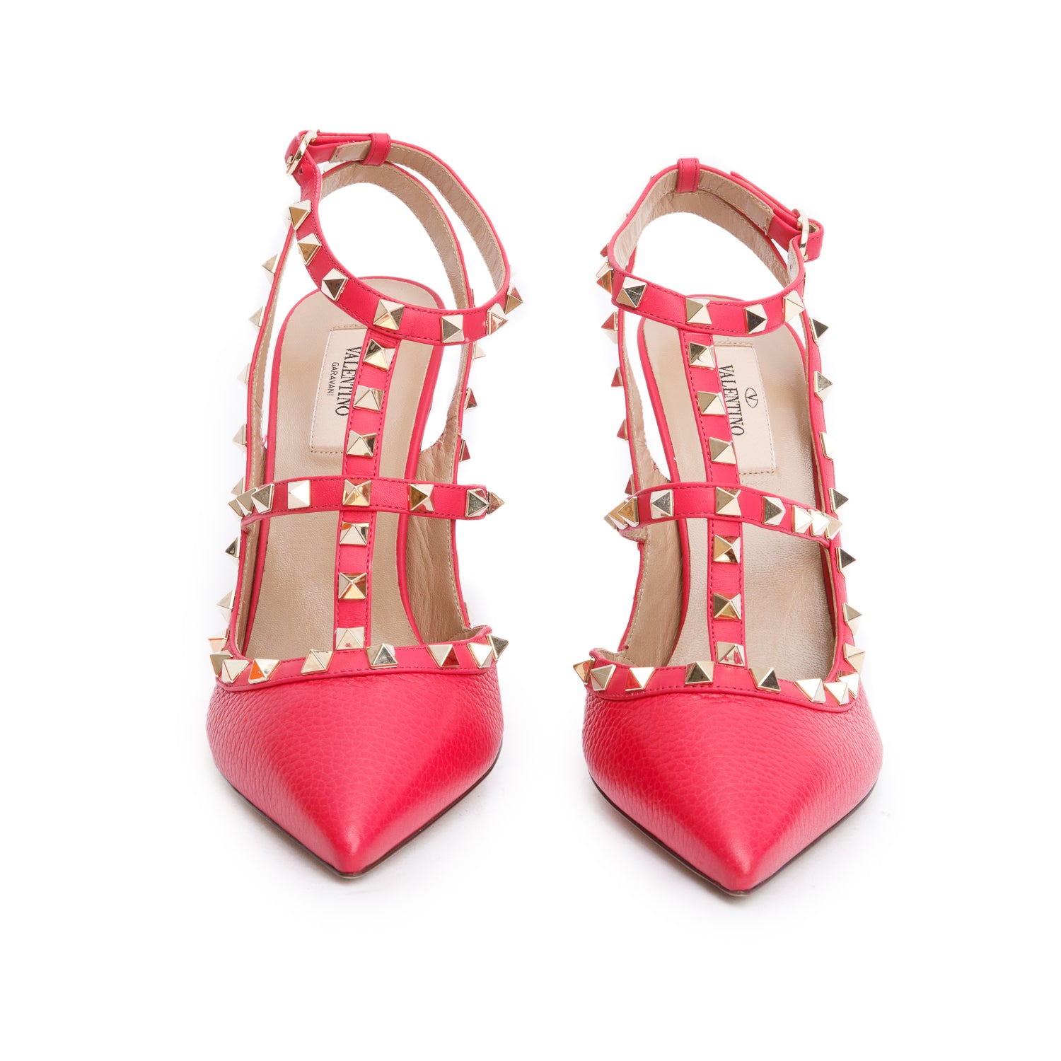 Red Leather Rockstud Ankle Strap Pumps, Size 41