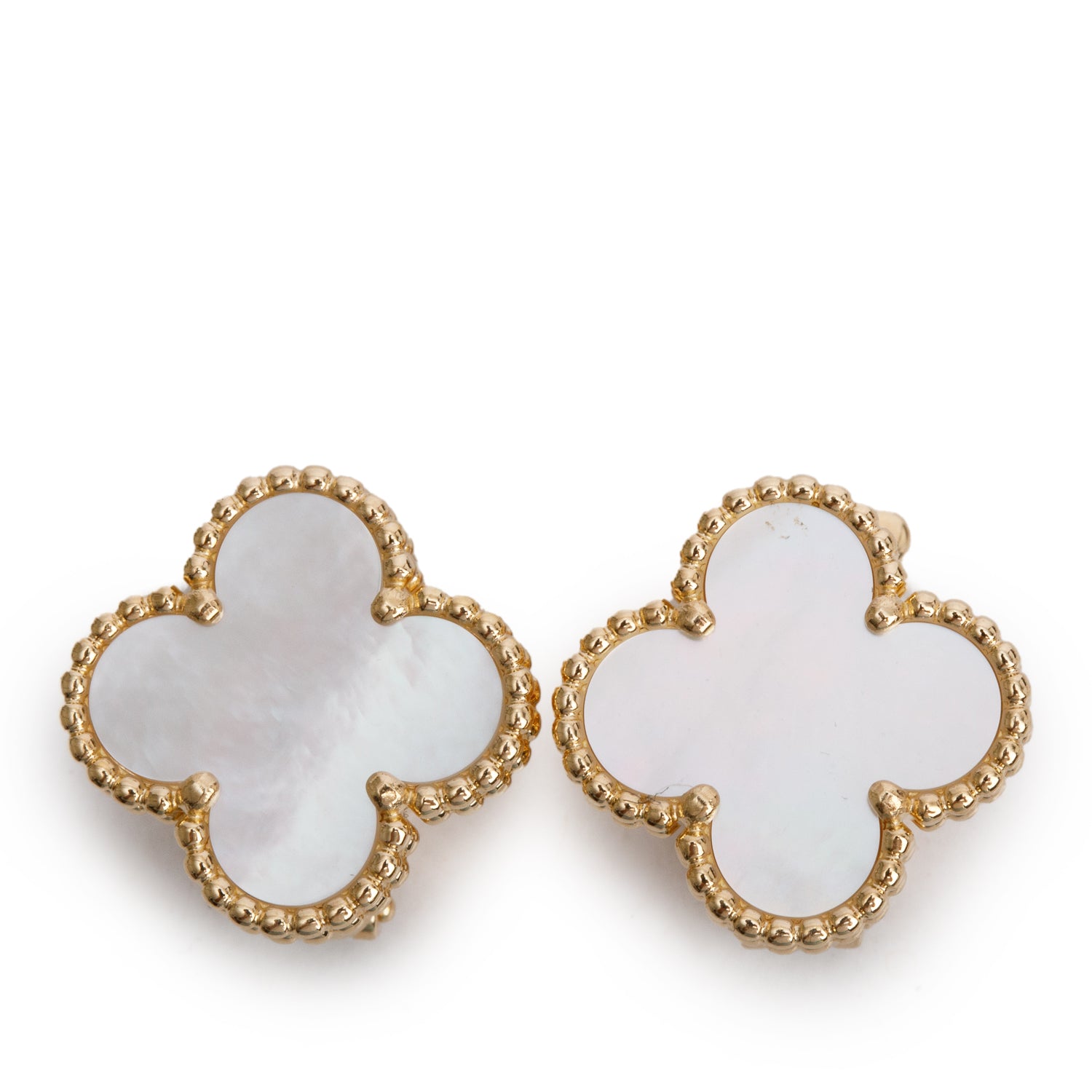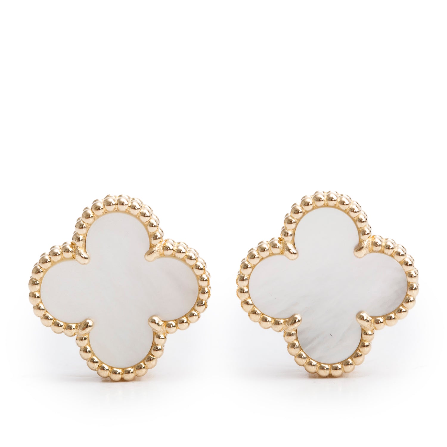 18k Yellow Gold Vintage Alhambra Mother of Pearl Stud Earrings w/ Receipt