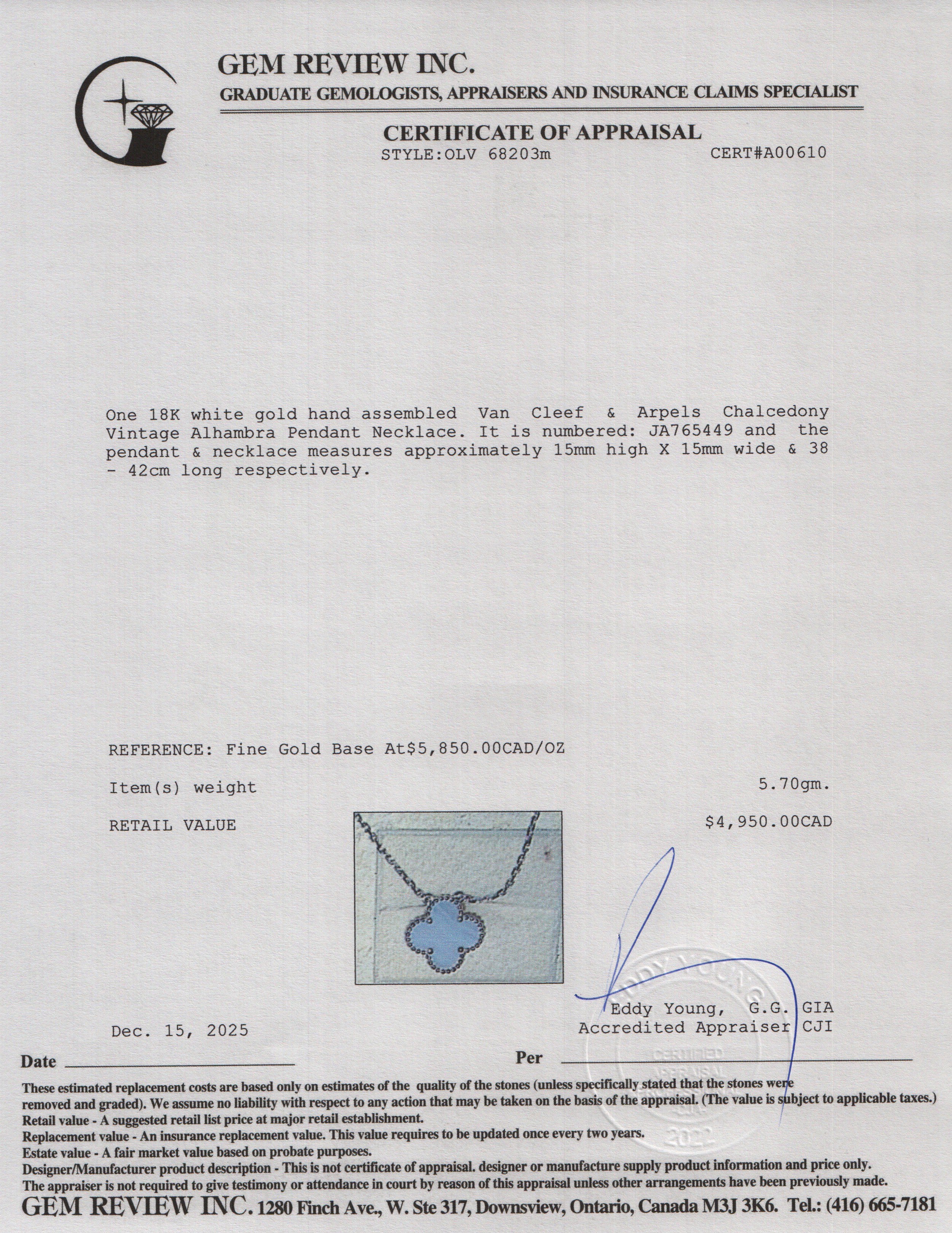 18k White Gold Chalcedony Vintage Alhambra Pendant Necklace w/ Box, Receipt & Certificate