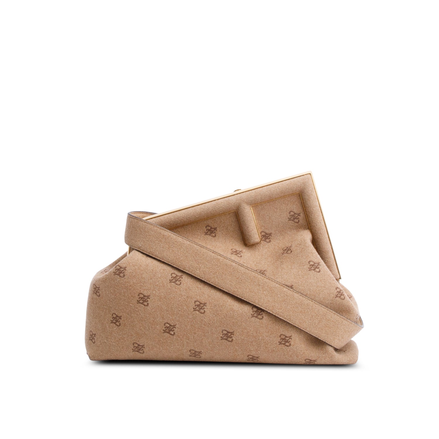 Beige Flannel Karligraphy Embroidered Medium First Bag w/ Strap
