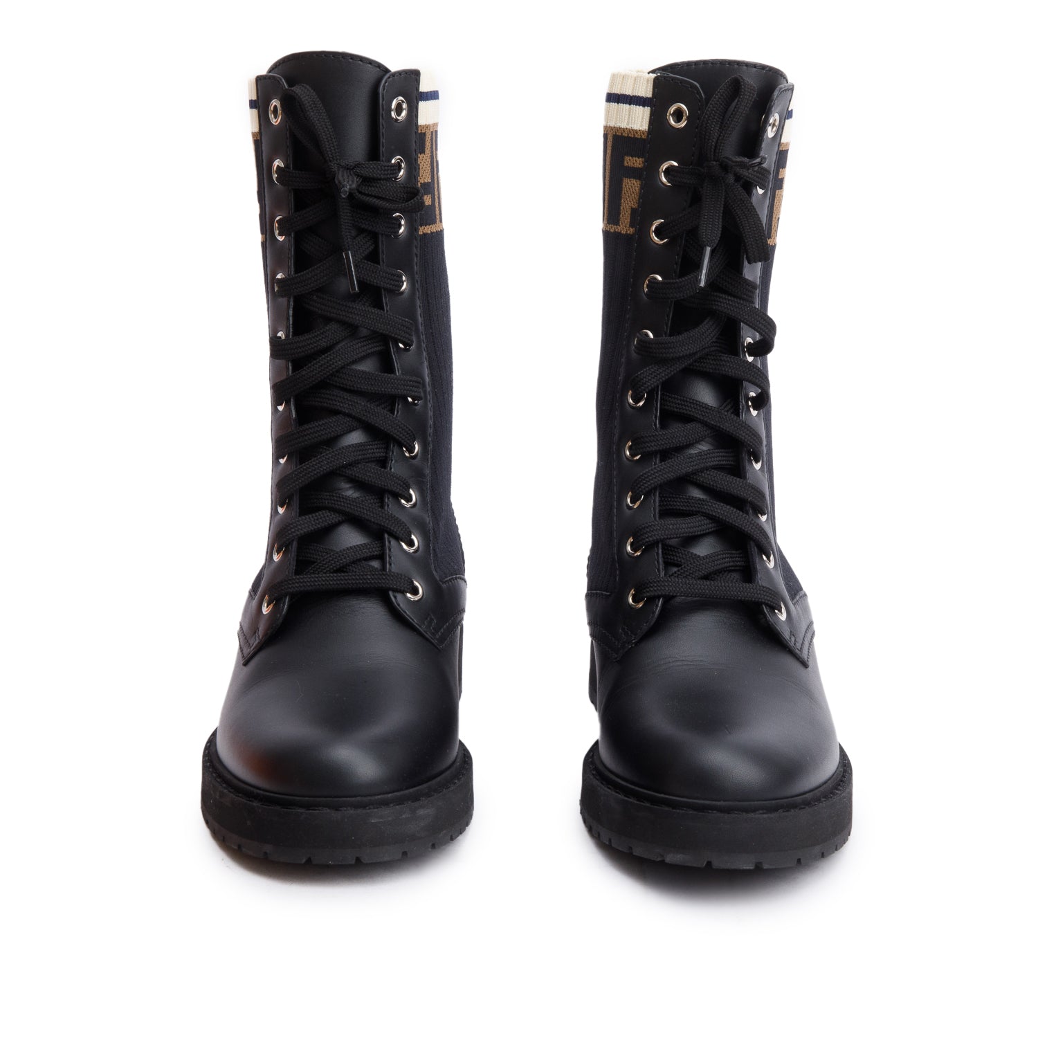 Black Leather FF Stretch Fabric Rockoko Biker Boots, Size 37