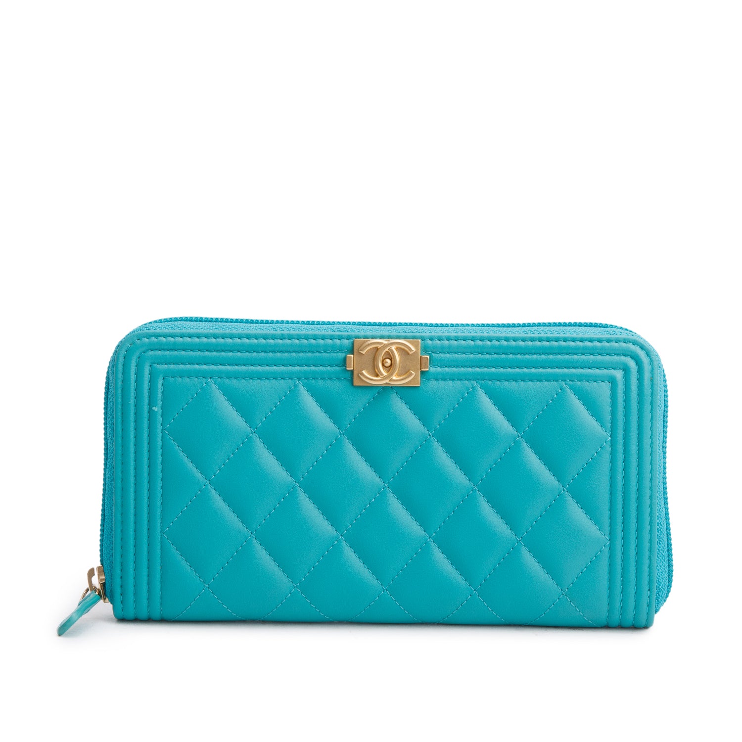 Teal Lambskin Quilted Boy Zip Around Wallet