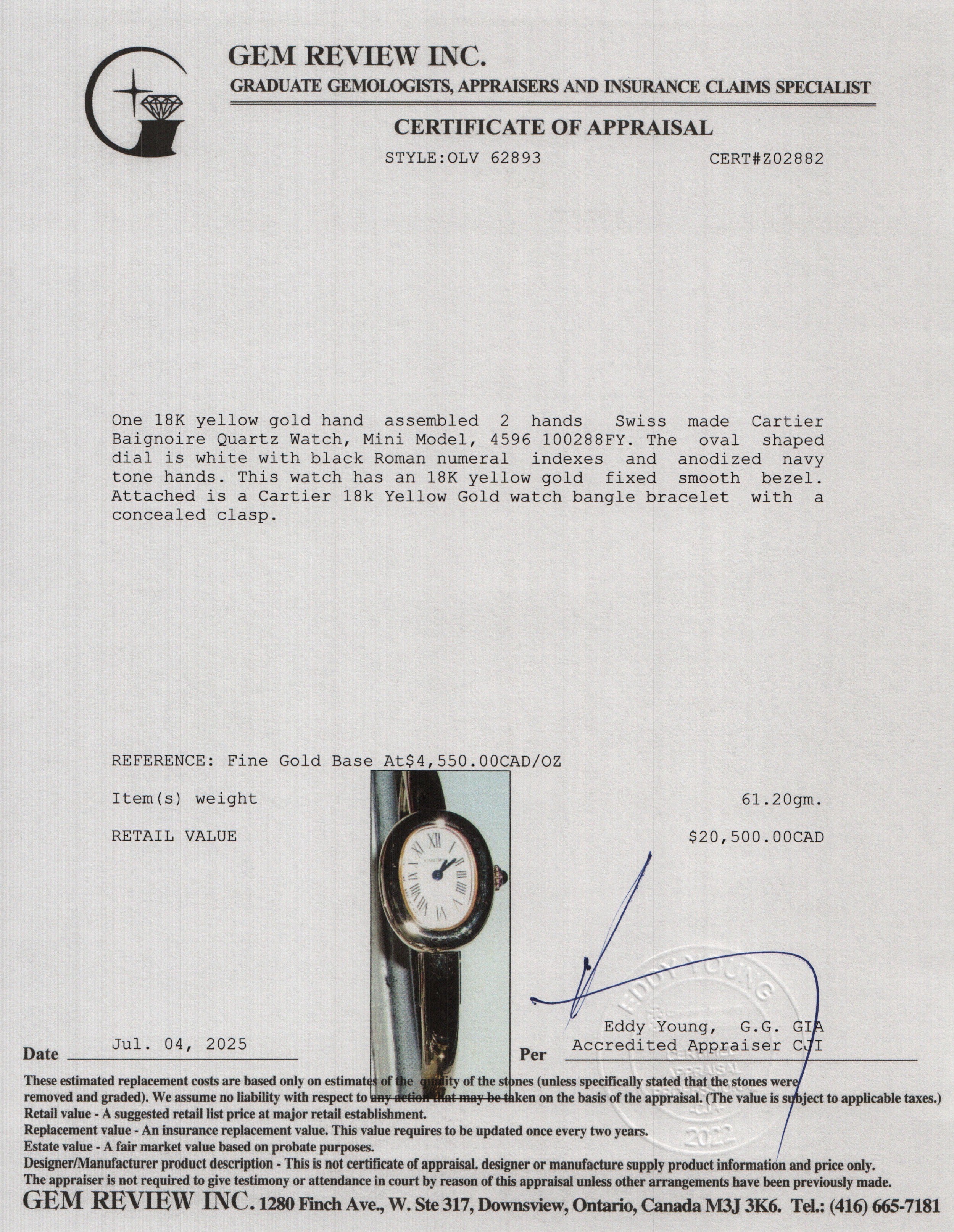2025 18k Yellow Gold Baignoire Quartz Watch, Mini Model 4596 w/ Box, Receipt & Papers