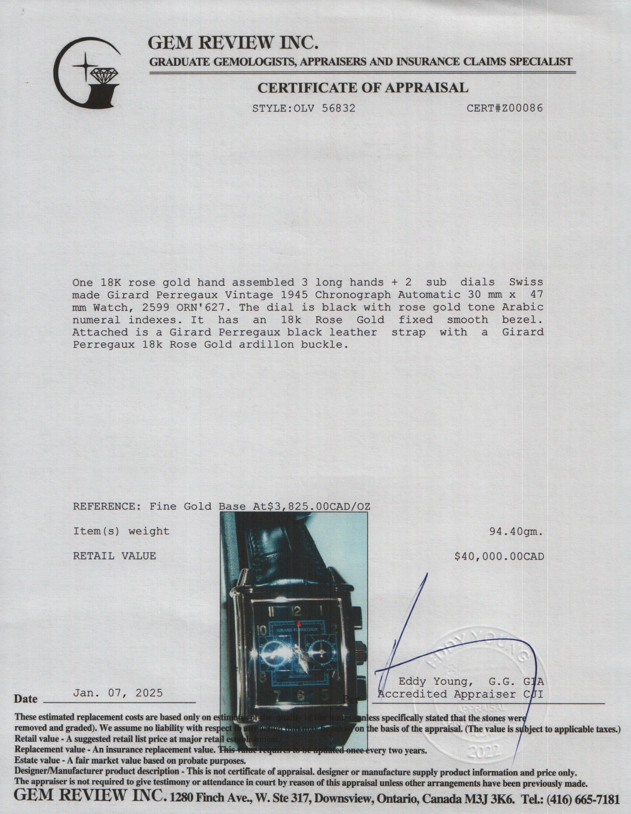 18k Rose Gold Black Dial Vintage 1945 Chronograph Automatic Watch 2599