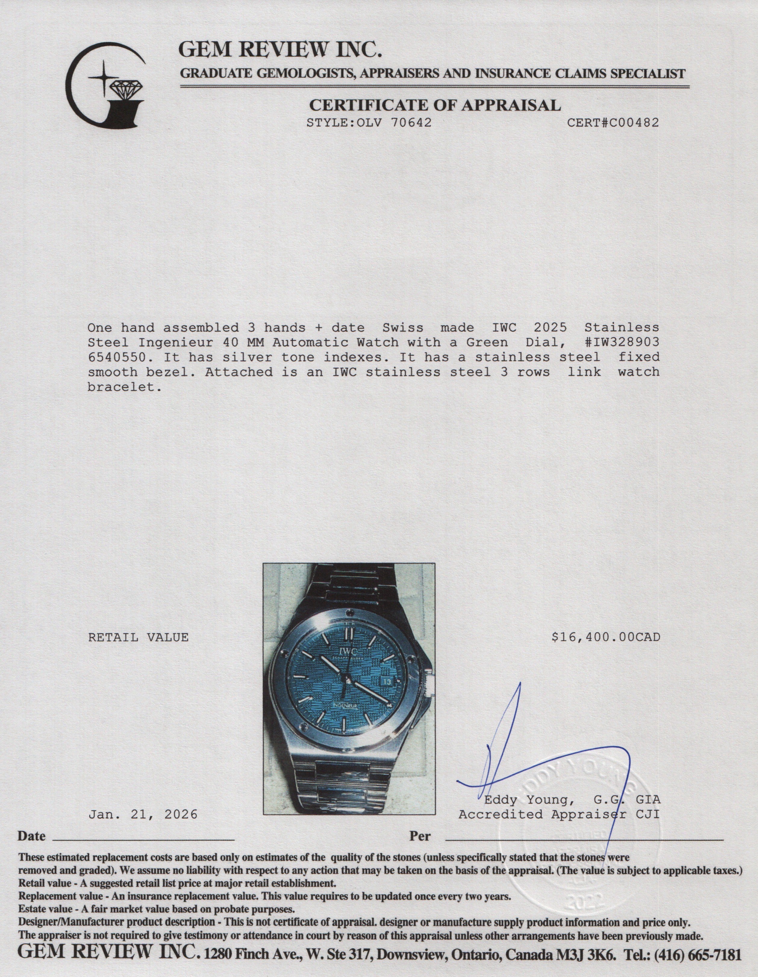 2025 Stainless Steel Ingenieur 40 MM Automatic Watch Green Dial IW328903 w/ Box & Papers