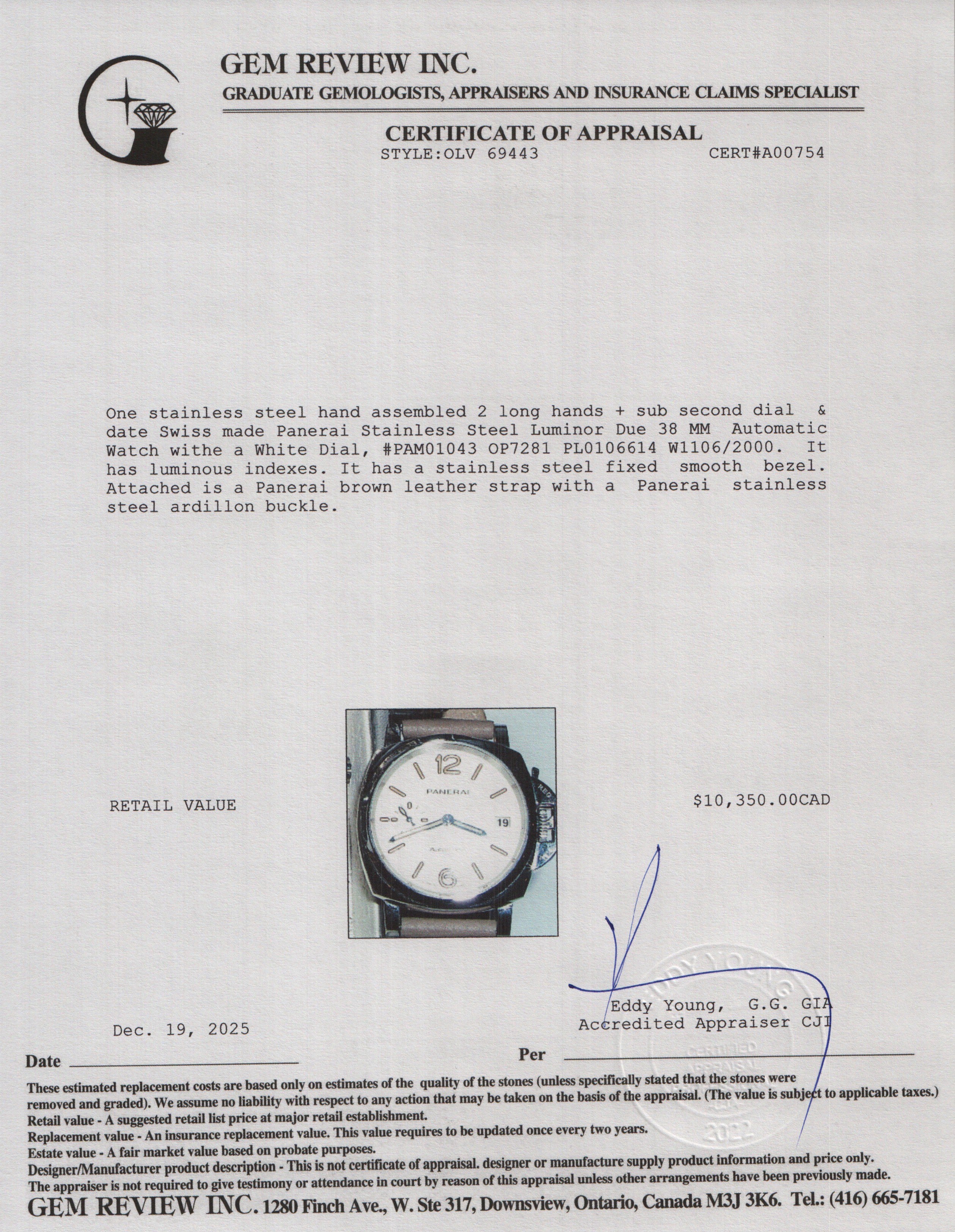Stainless Steel Luminor Due 38 MM Automatic Watch White Dial PAM01043 w/ Box & Papers