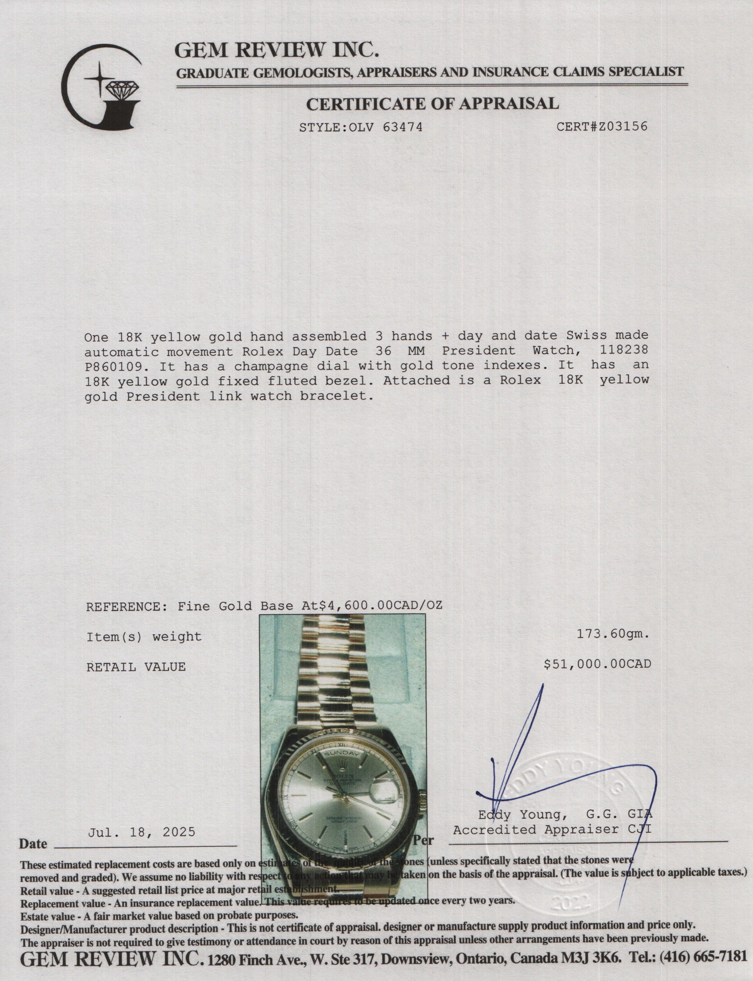 18k Yellow Gold Day Date 36 MM President Watch 118238 w/ Box & Papers