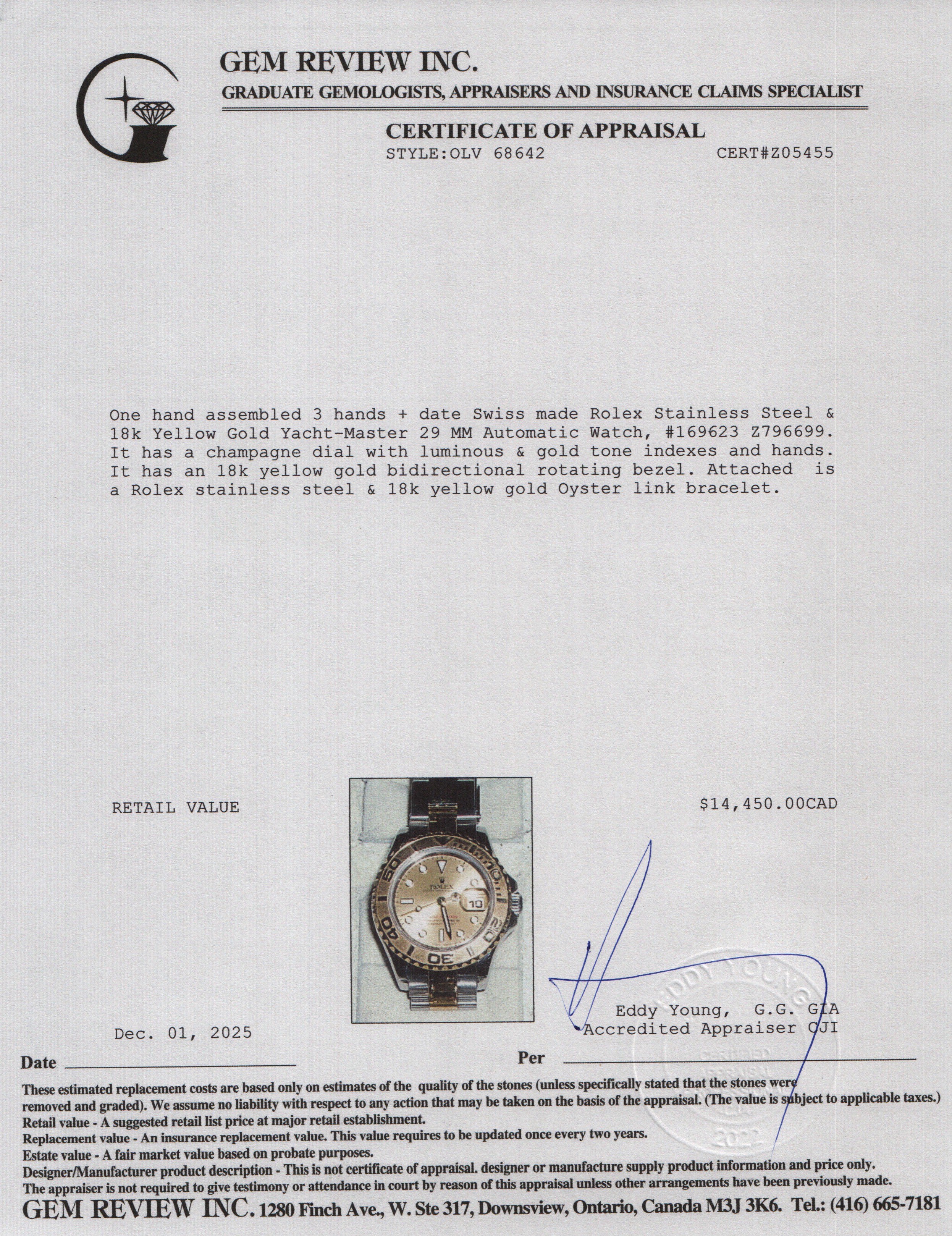 Stainless Steel & 18k Yellow Gold Yacht-Master 29 MM Automatic Watch Gold Dial 169623 w/ Box & Papers