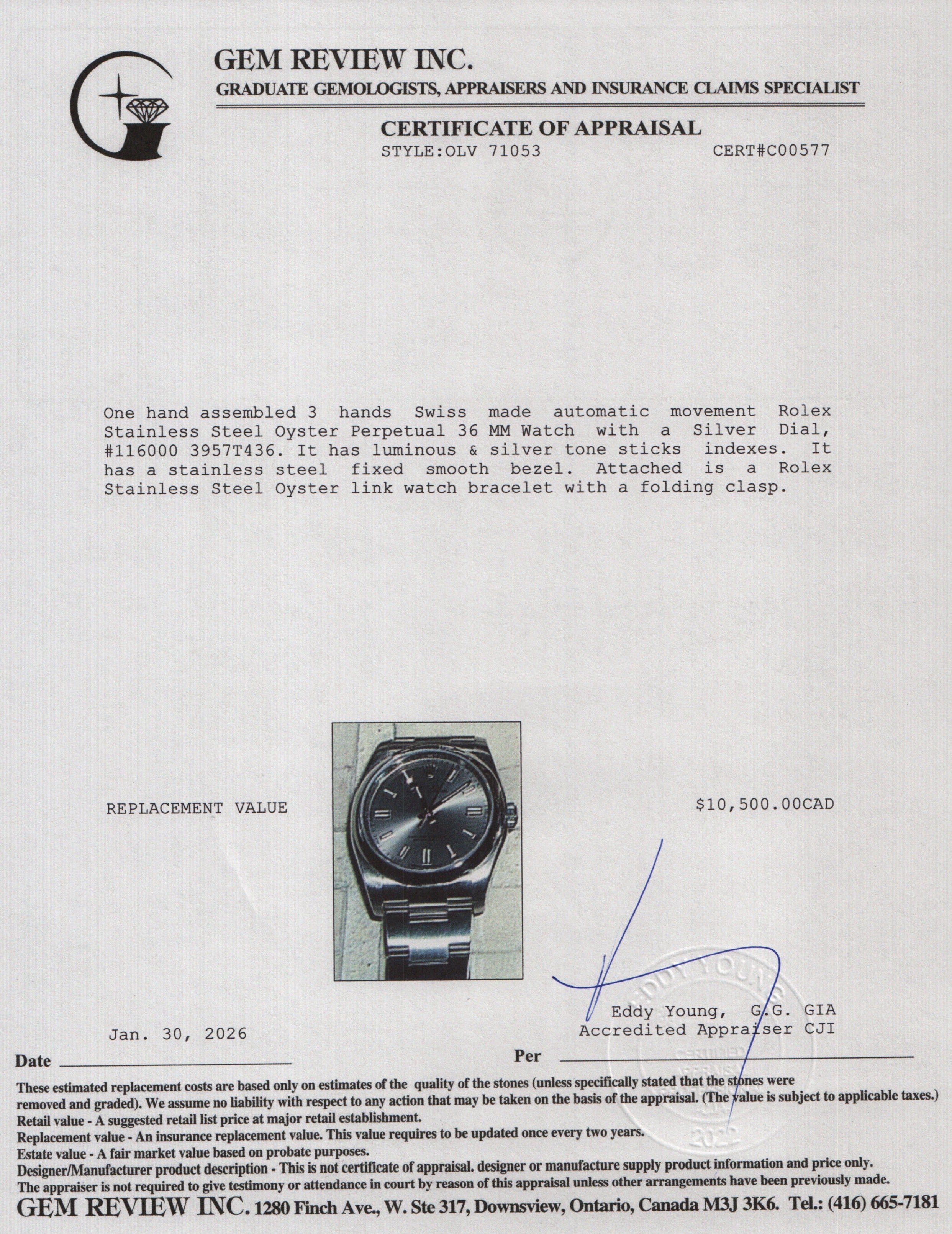 Stainless Steel Oyster Perpetual 36 MM Watch Silver Dial 116000 w/ Box & Papers