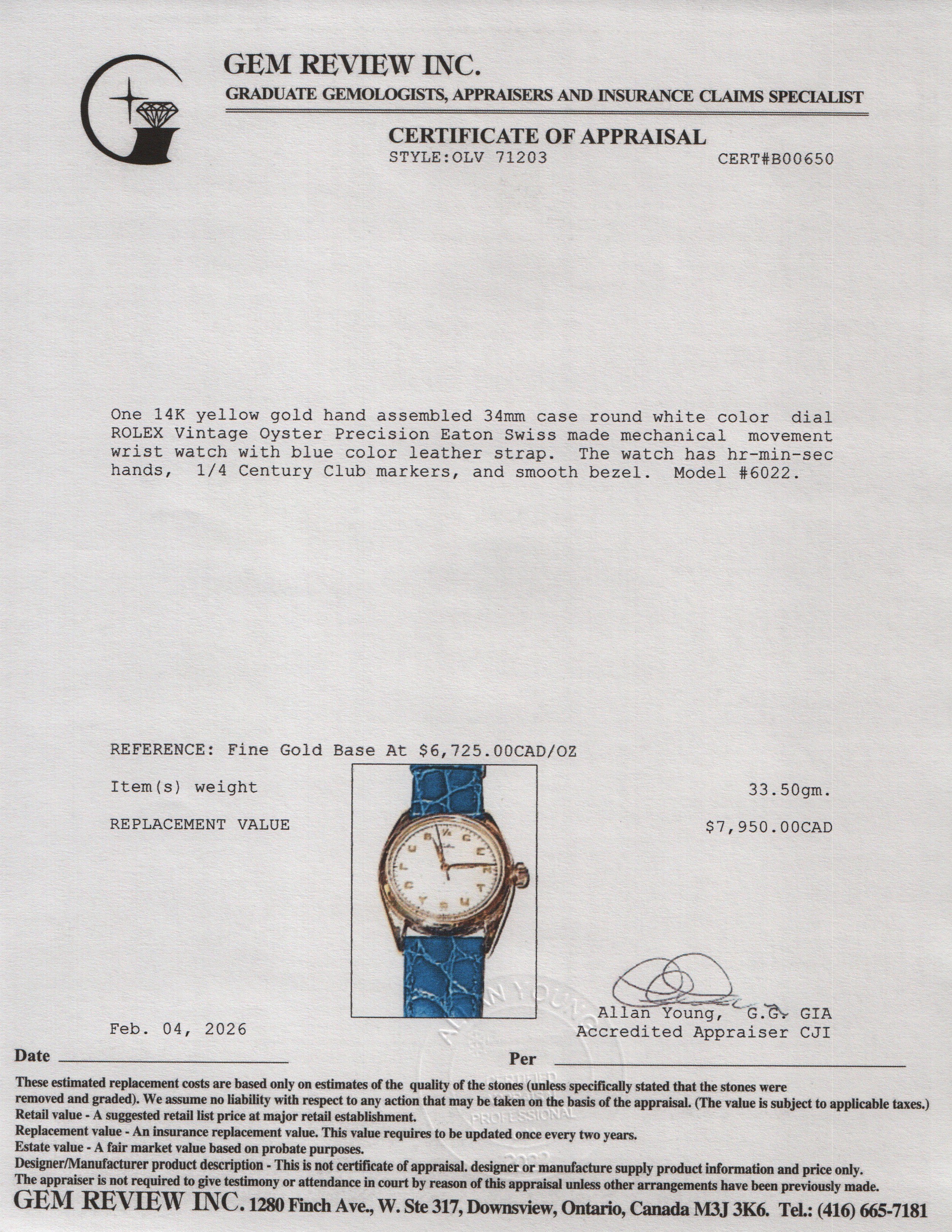 Vintage 14k Yellow Gold Oyster Precision Eaton 1/4 Century Club 34 MM Manual Watch 6022