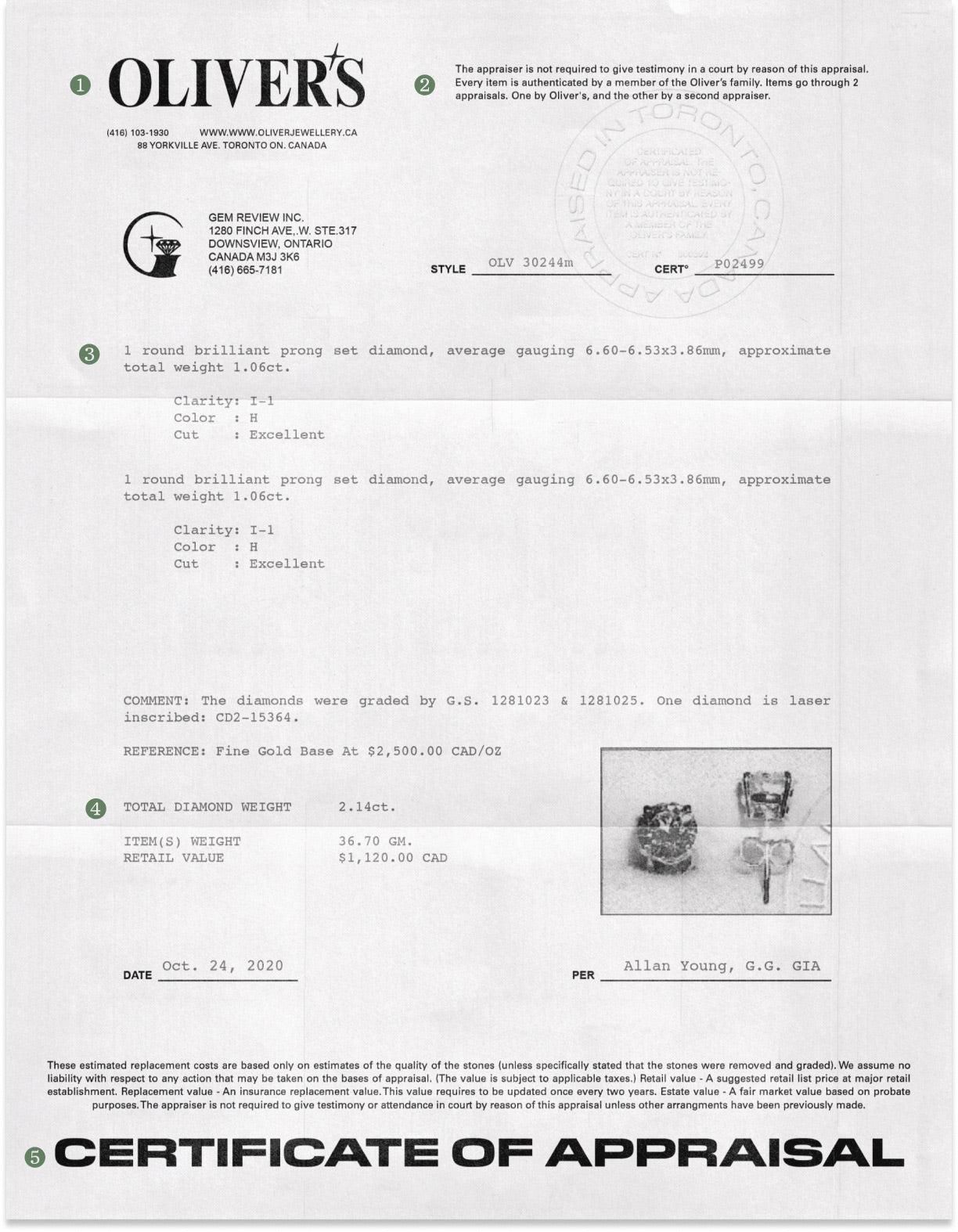 Every Oliver’s product comes with an appraisal certificate verifying its authenticity, just like this one for a pair of Antique Solitaire Diamond Stud Earrings.