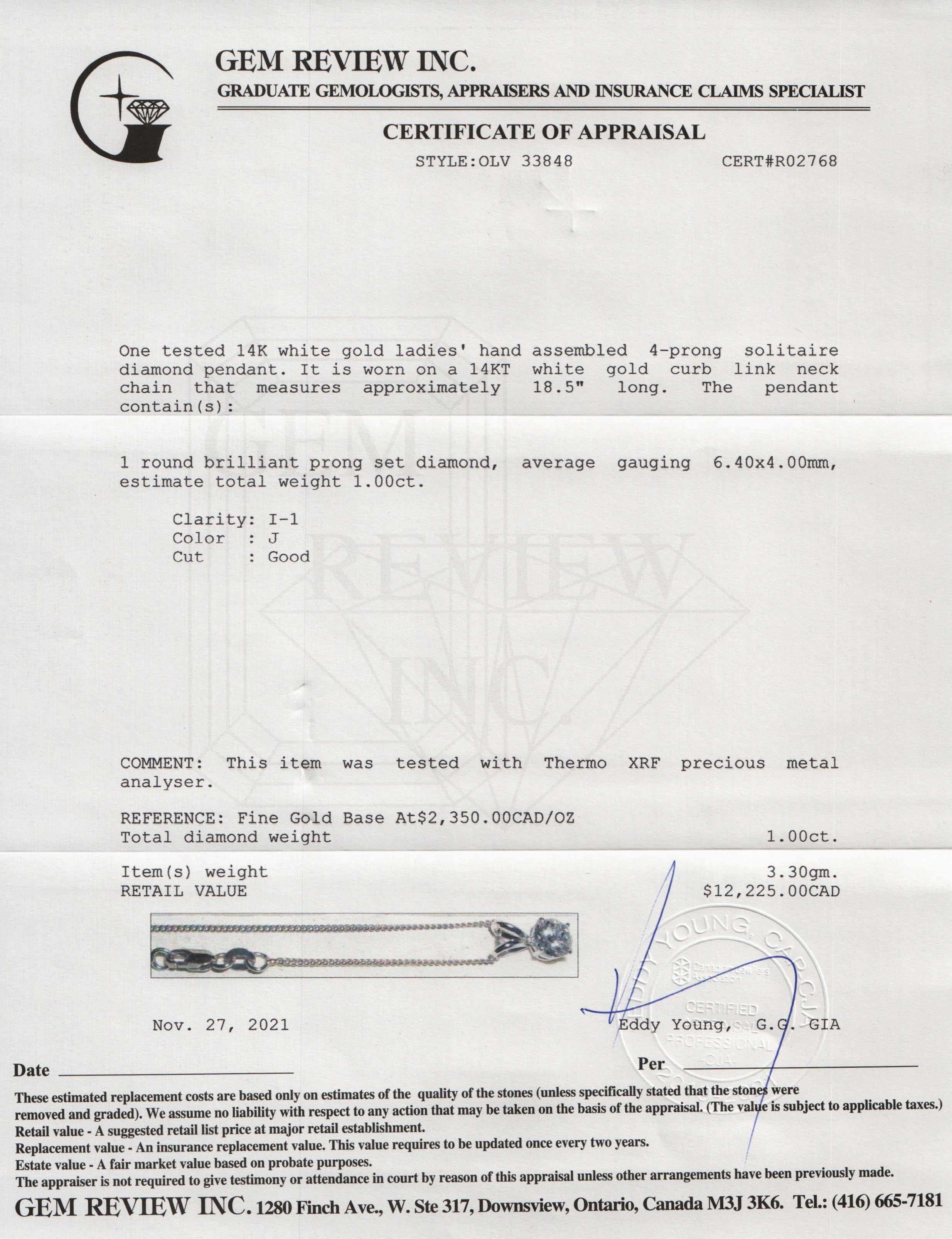- 1 Round Brilliant Cut Diamond Weighing Approximately 1.00 ct. of I1 Clarity, J Colour, Good Cut