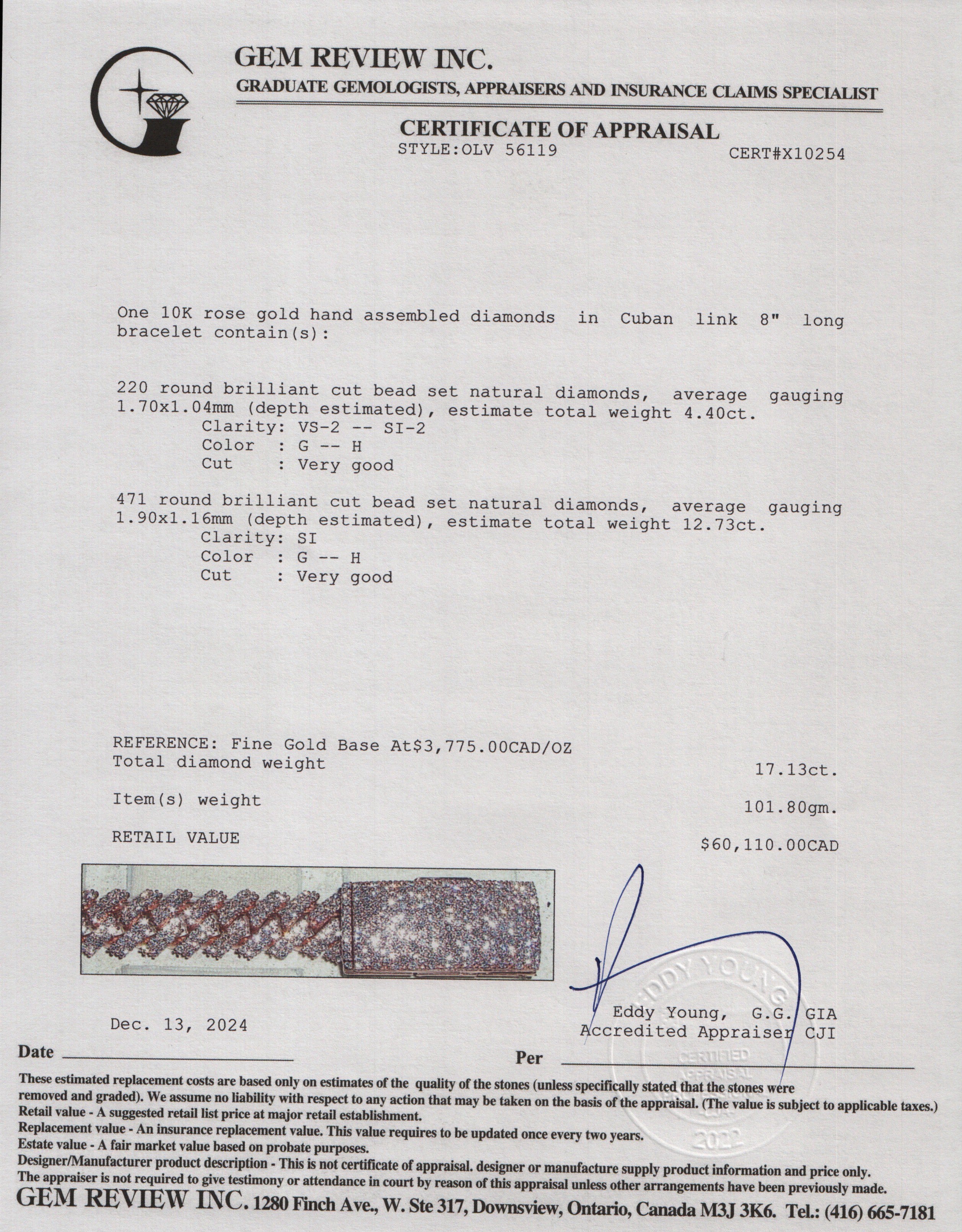 10k Rose Gold 17.13 tcw. Diamond Cuban Link Bracelet