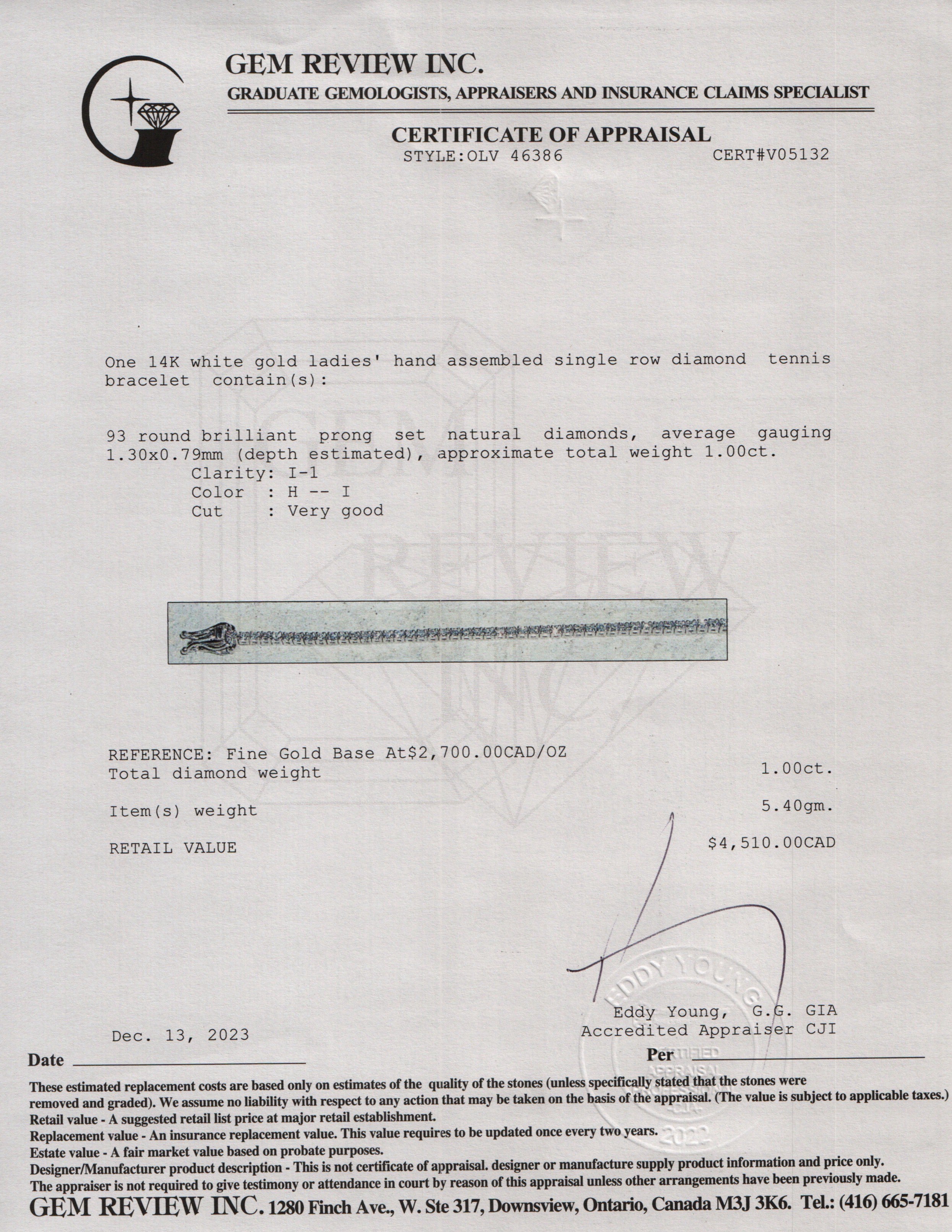 14k White Gold 1.00 tcw Diamond Tennis Bracelet