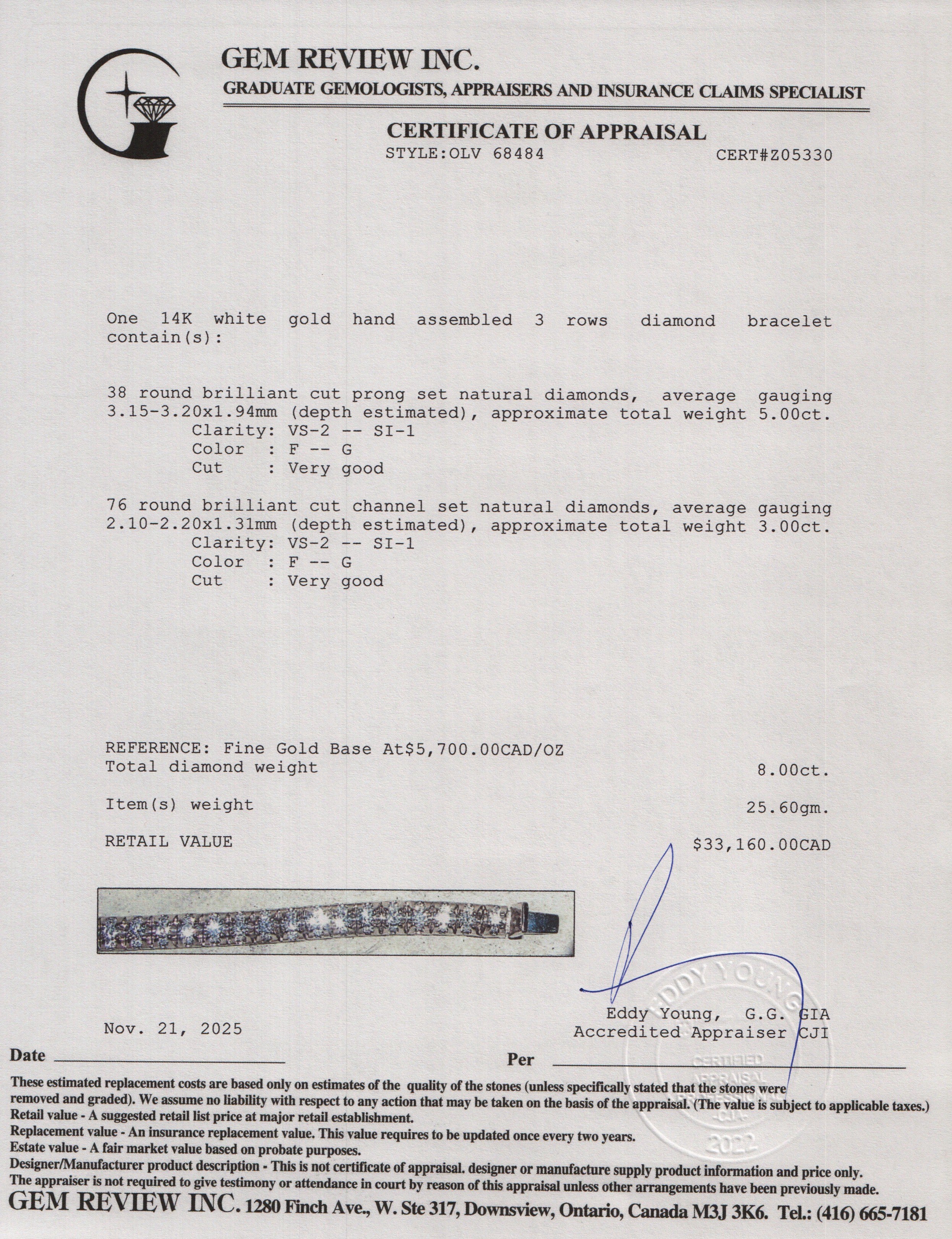 14k White Gold 8.00 tcw. Three-Rows Diamond Bracelet