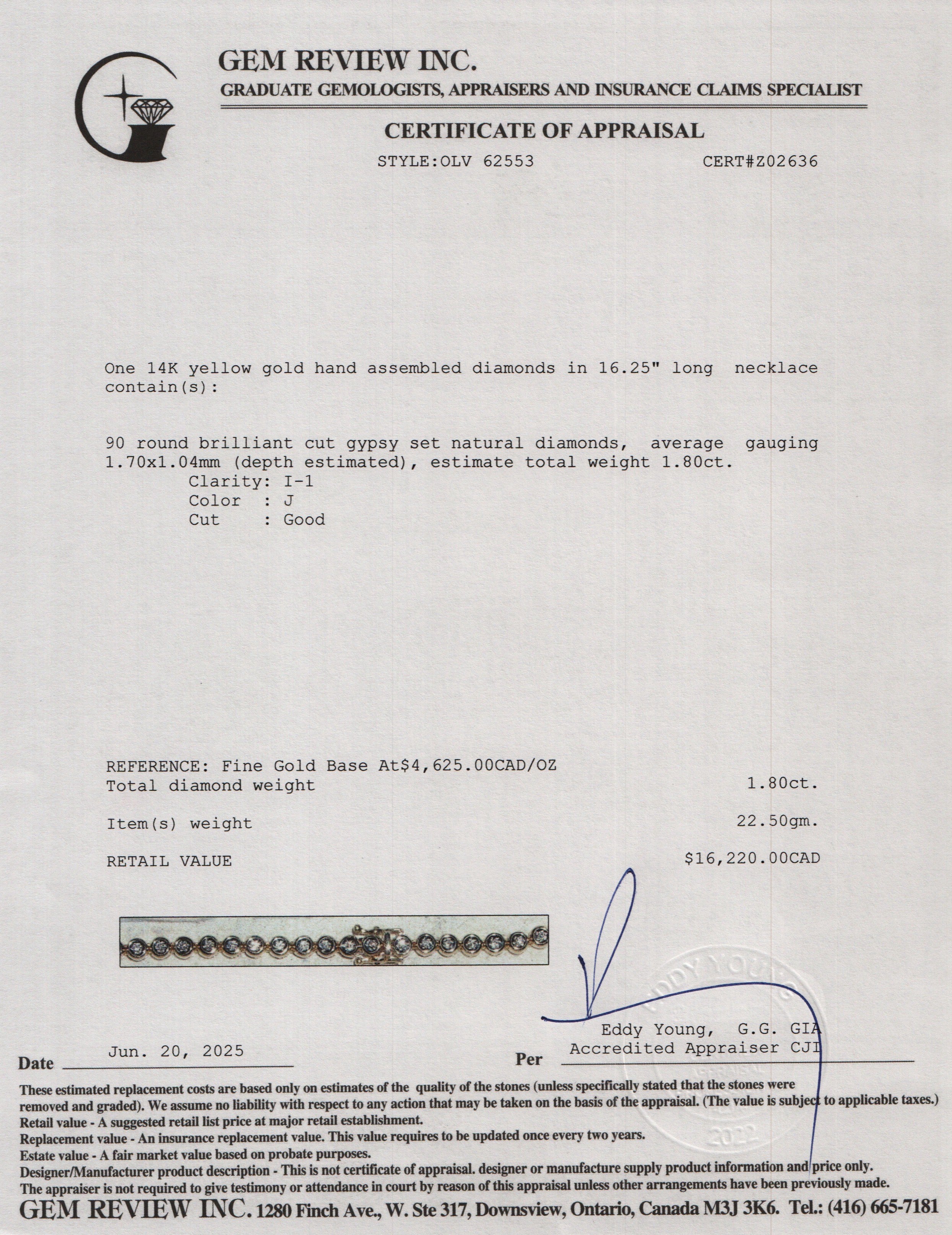 14k Yellow Gold 1.80 tcw. Diamond Tennis Necklace