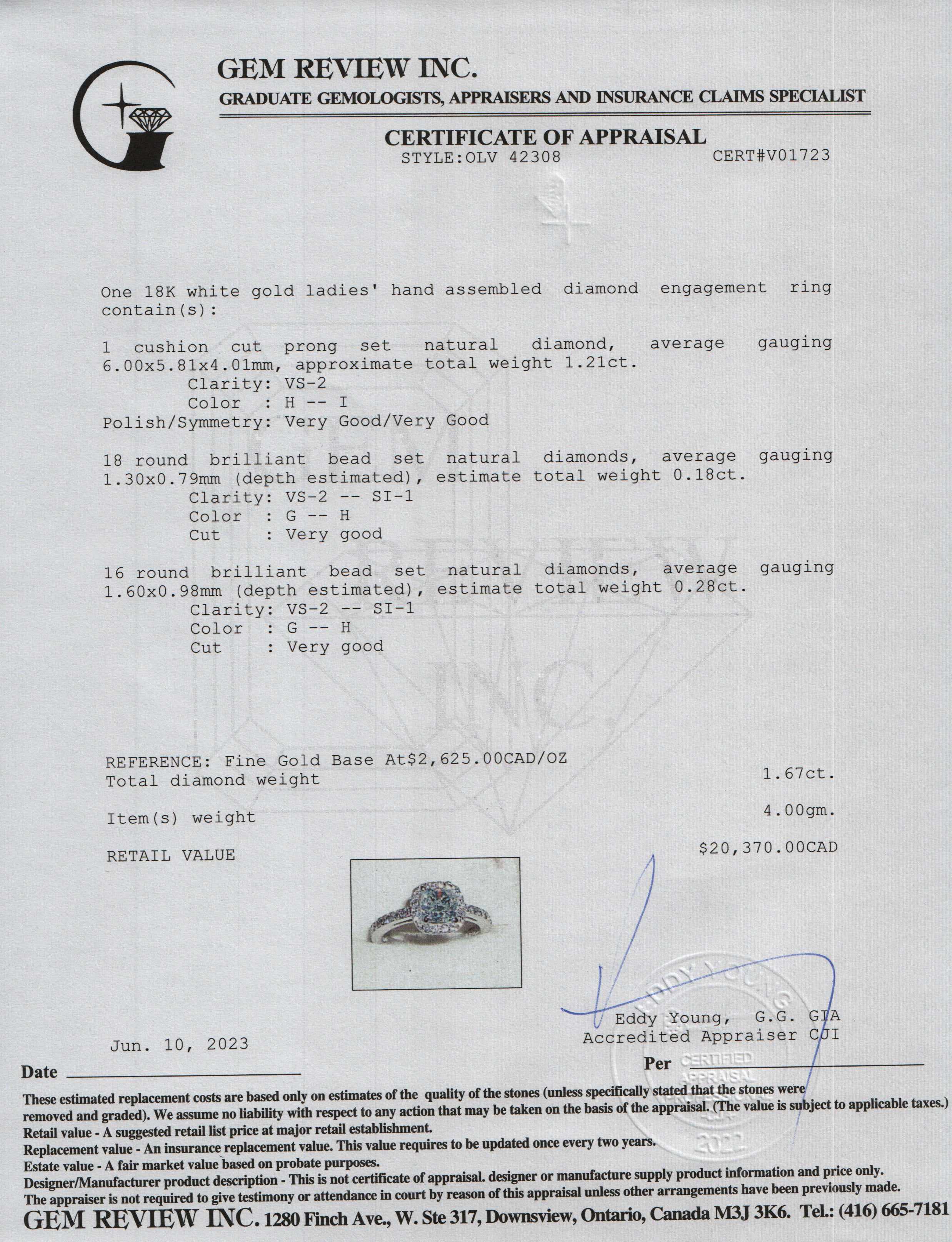 - 1 Cushion Cut Diamond Weighing Approximately1.21 ct. of VS2 Clarity, H-I Colour, Very Good Cut