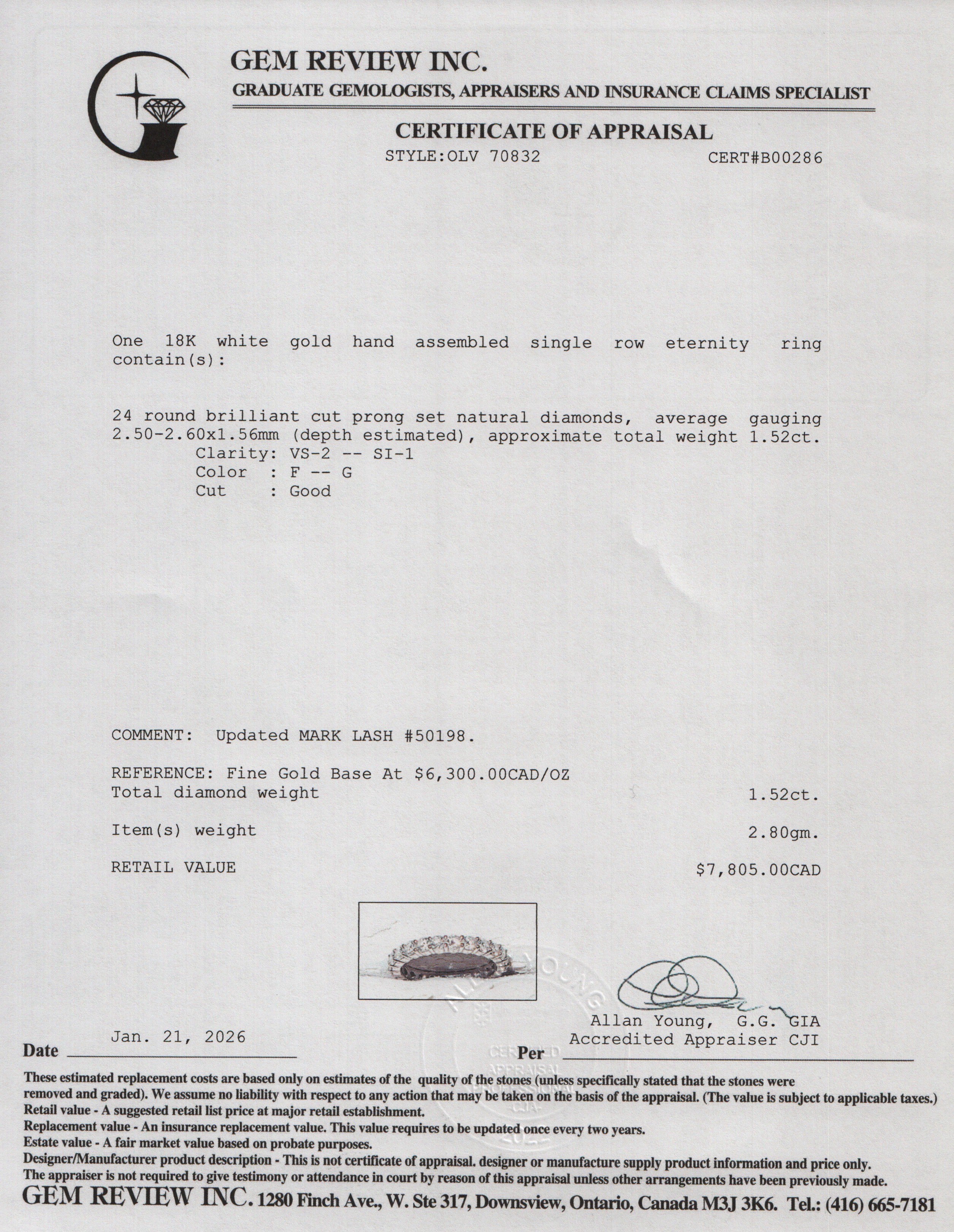 18k White Gold 1.52 tcw. Diamond Eternity Band Ring, Size 6.25