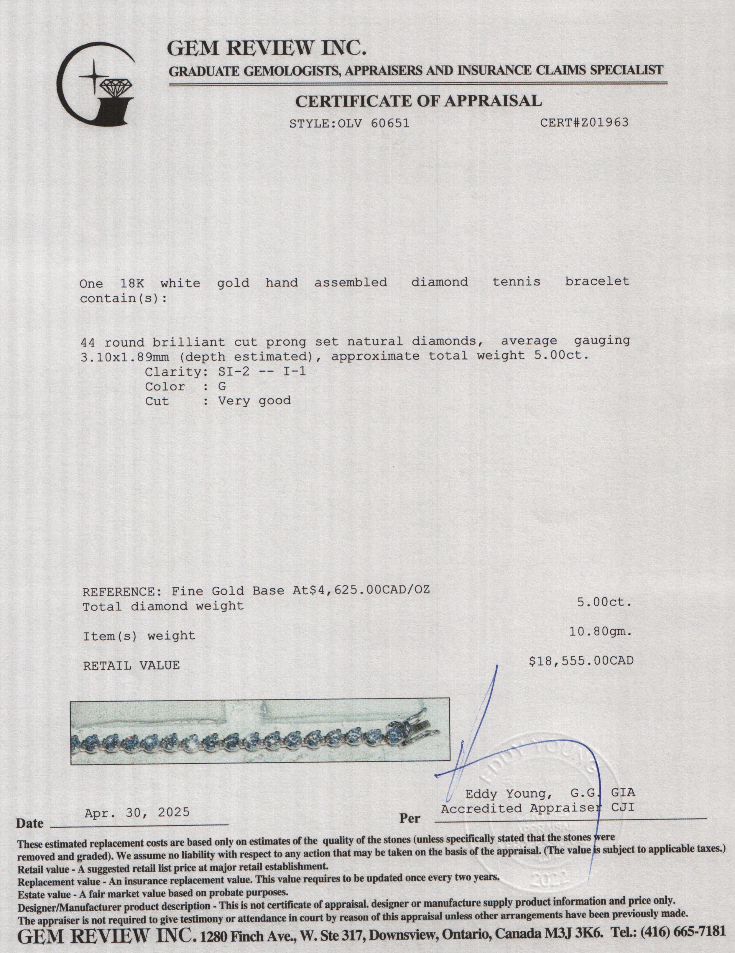 18k White Gold 5.0 tcw. Diamond Tennis Bracelet