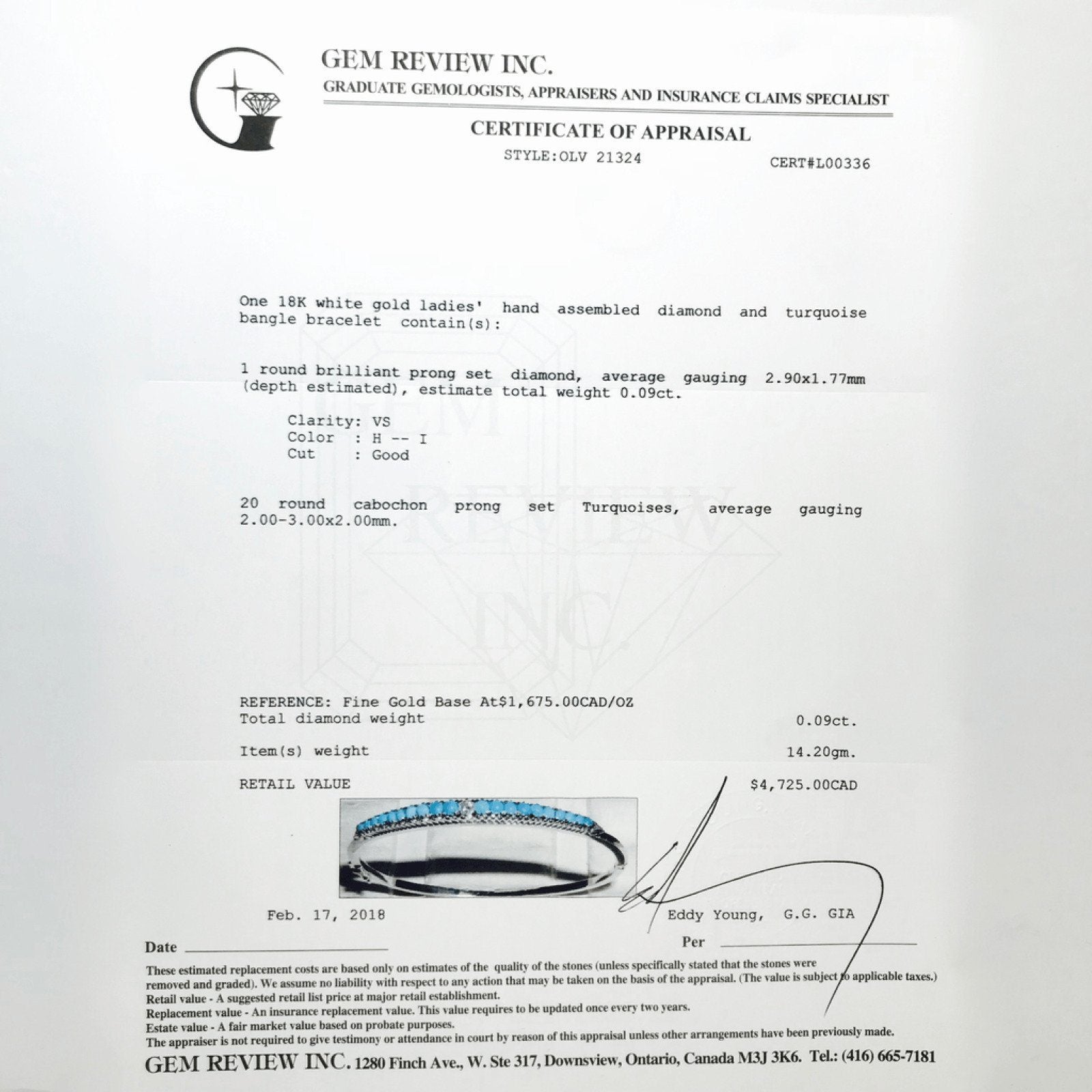 18K White Gold Diamond and Turquoise Bangle Bracelet Containing 1 Round Brilliant Cut Diamond (0.09 CT) and 20 Round Cabochon Turquoises, Comes with Gem Review Appraisal