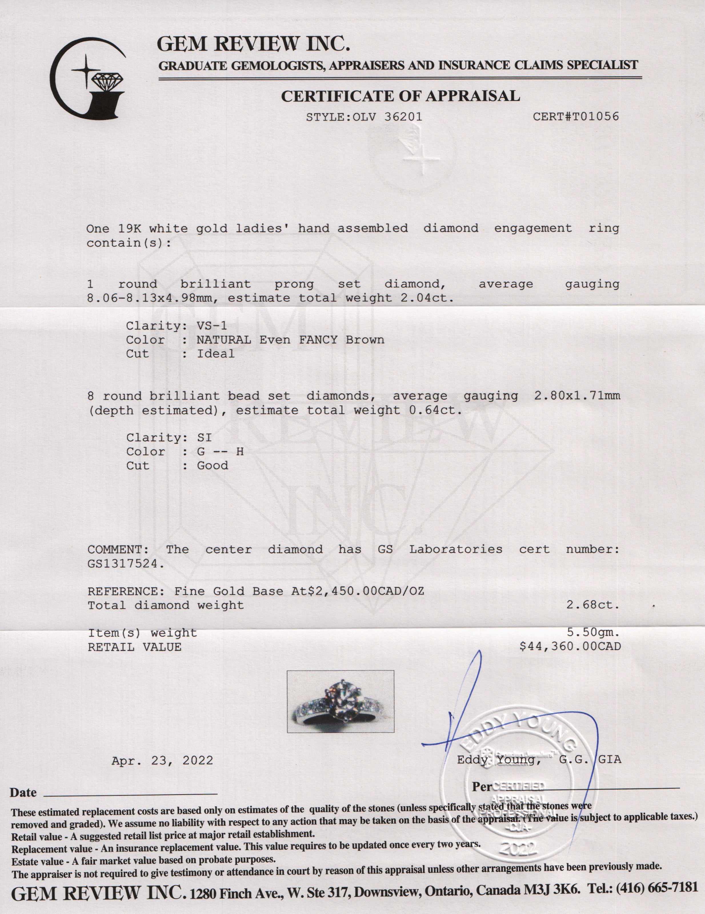 - 1 Round Brilliant Cut Diamond Weighing Approximately 2.04 ct. of VS1 Clarity, Natural Even Fancy Brown Colour, Ideal Cut