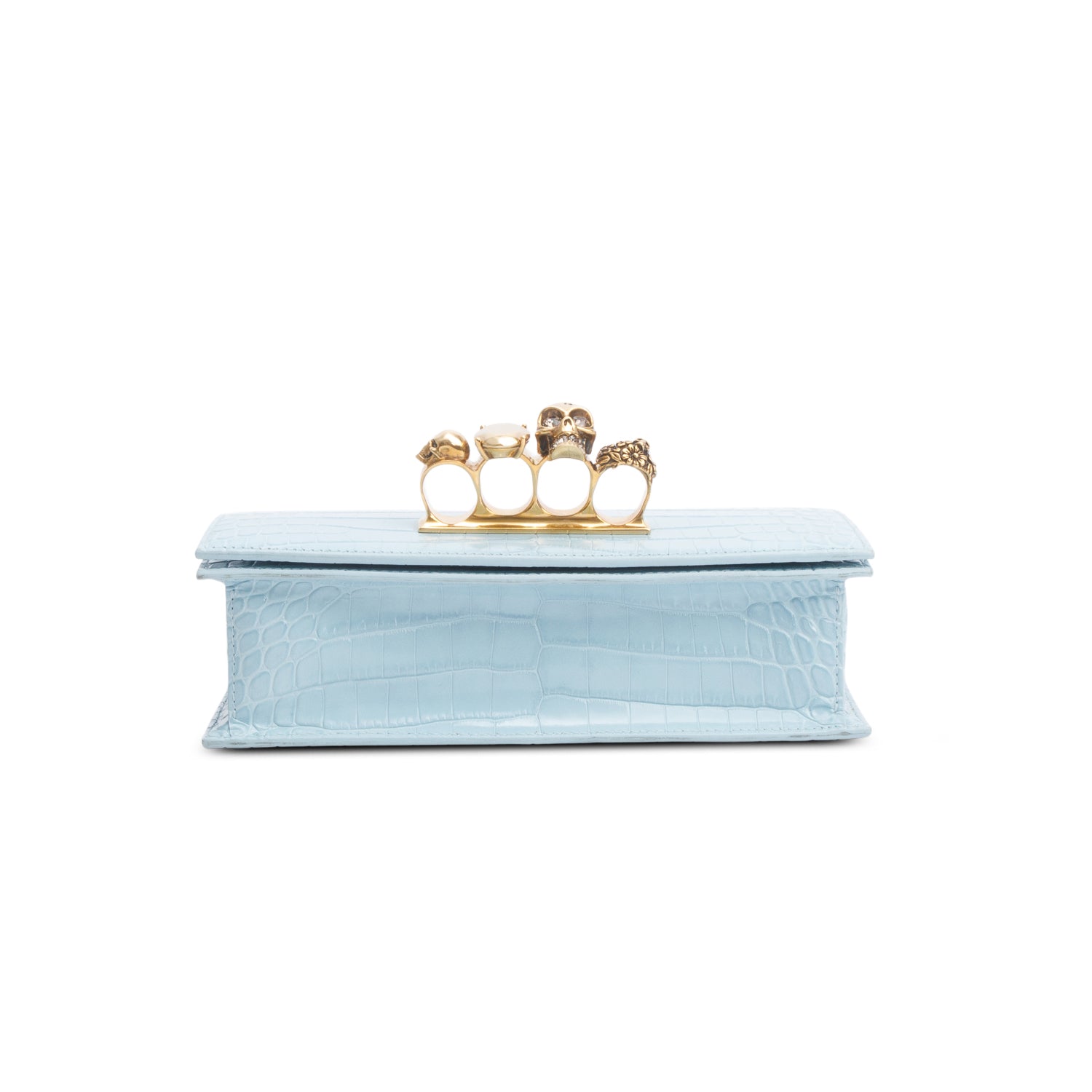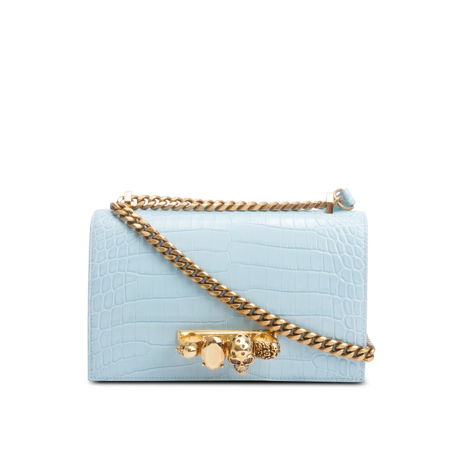 Blue Calfskin Croc Embossed Jeweled Knuckle Satchel