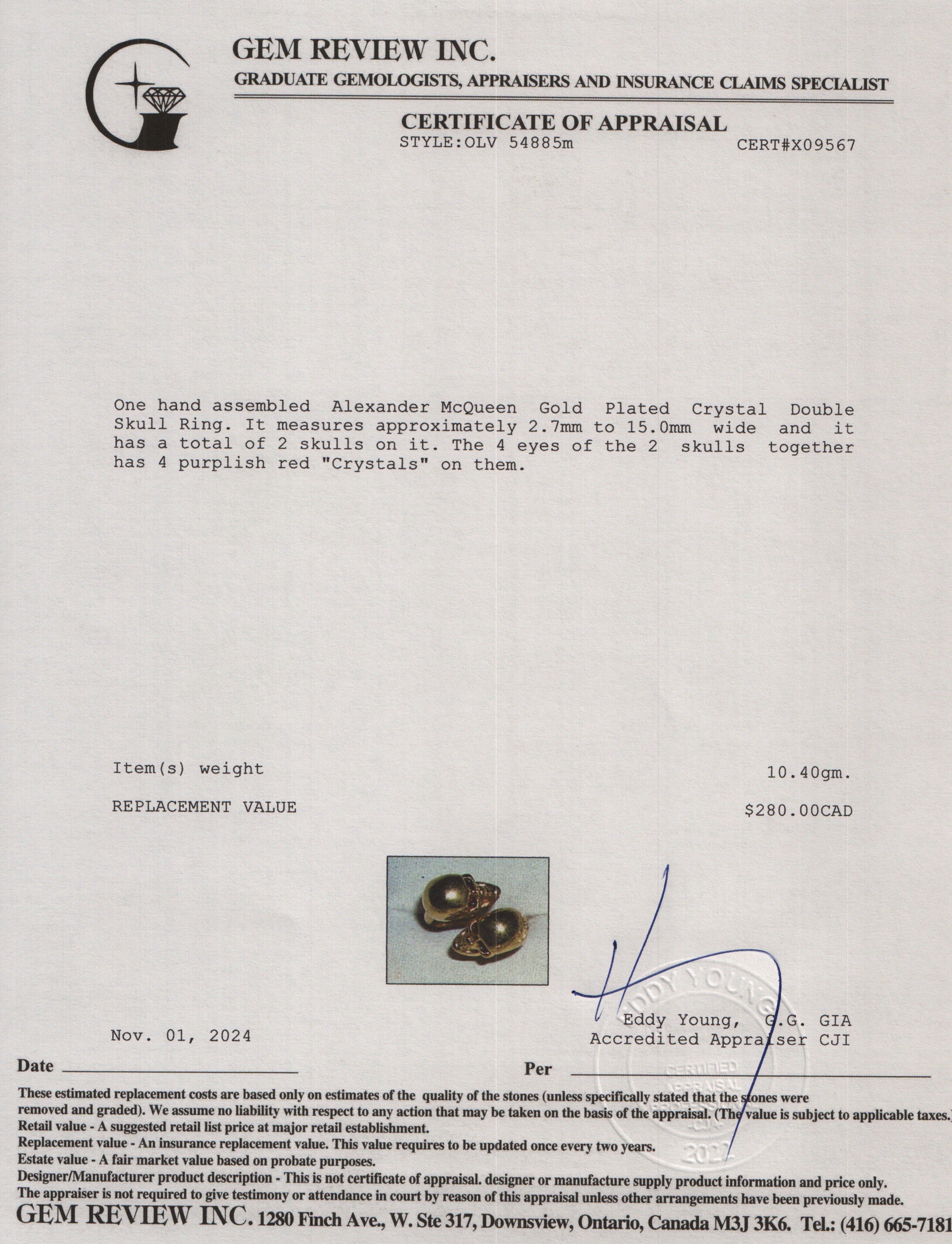 Gold Plated Crystal Double Skull Ring, Size 5.5