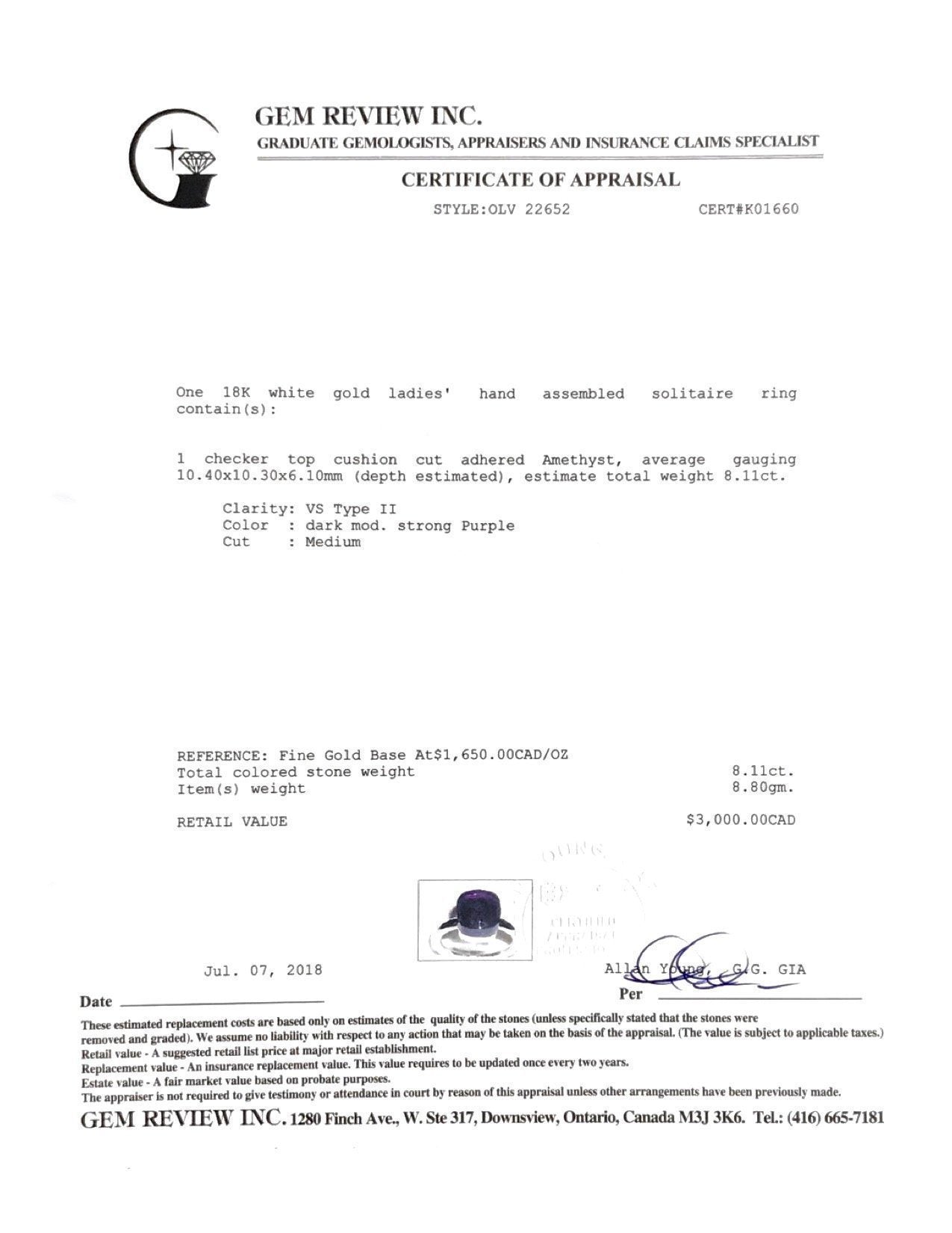 - 1 Cushion Cut Amethysts Weighing Approximately 8.11 ct.