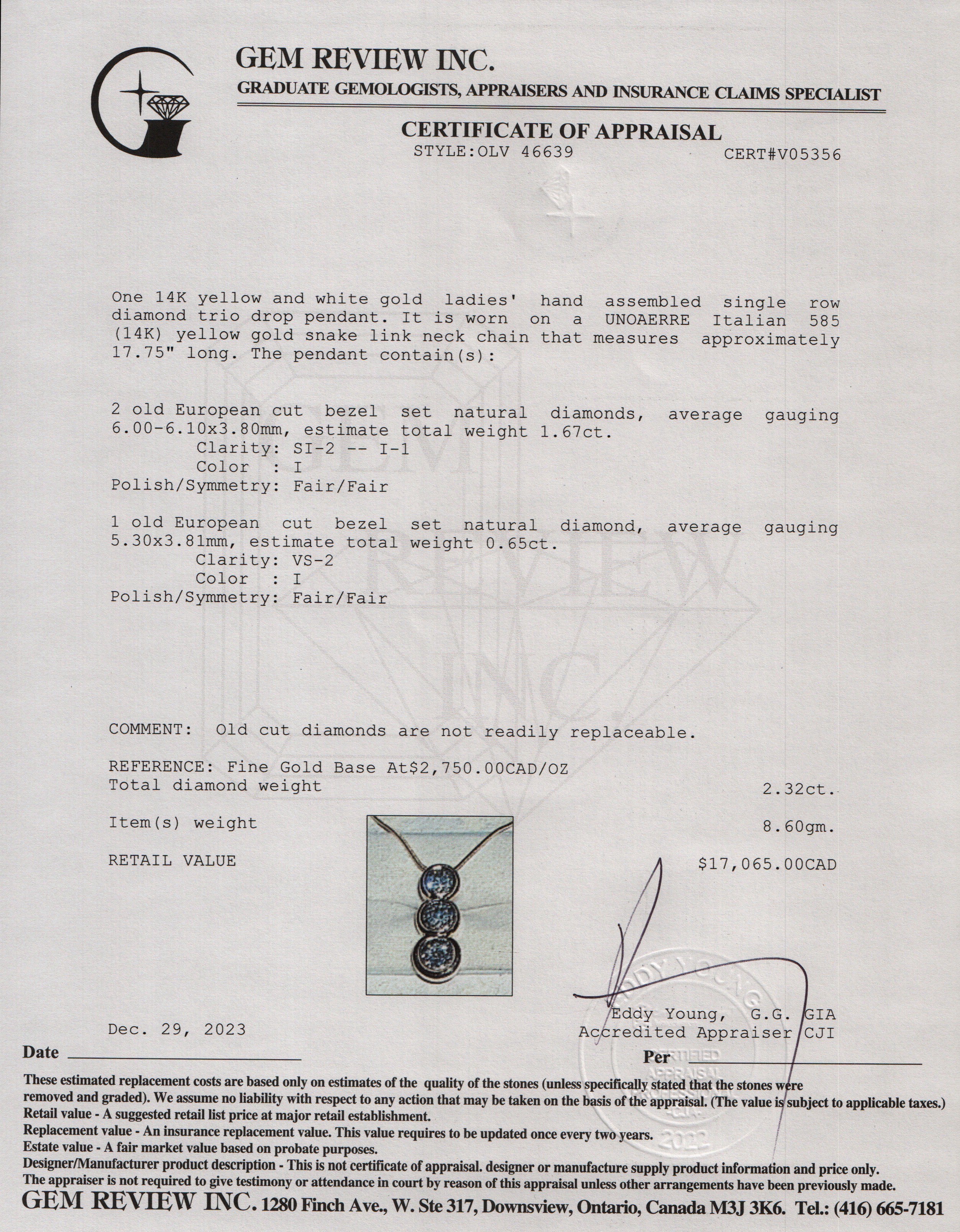 Antique 14k Yellow Gold Three Stone Diamond Drop Pendant Necklace