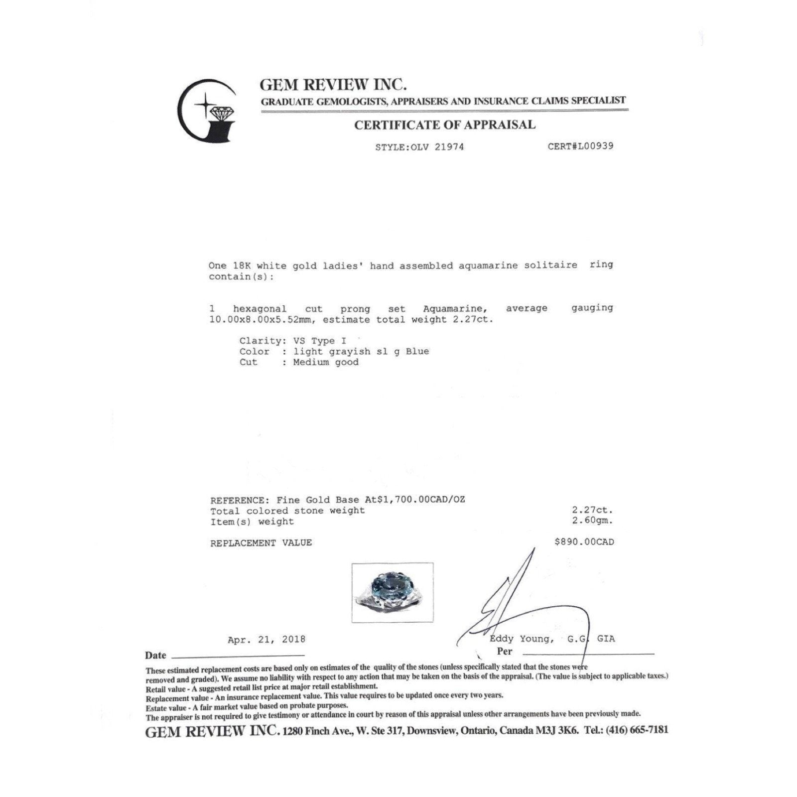 - 1 Hexagonal Cut Aquamarine (2.27 Estimated Total Carat Weight) ; 10.00 x 8.00 x 5.52mm Estimated Depth