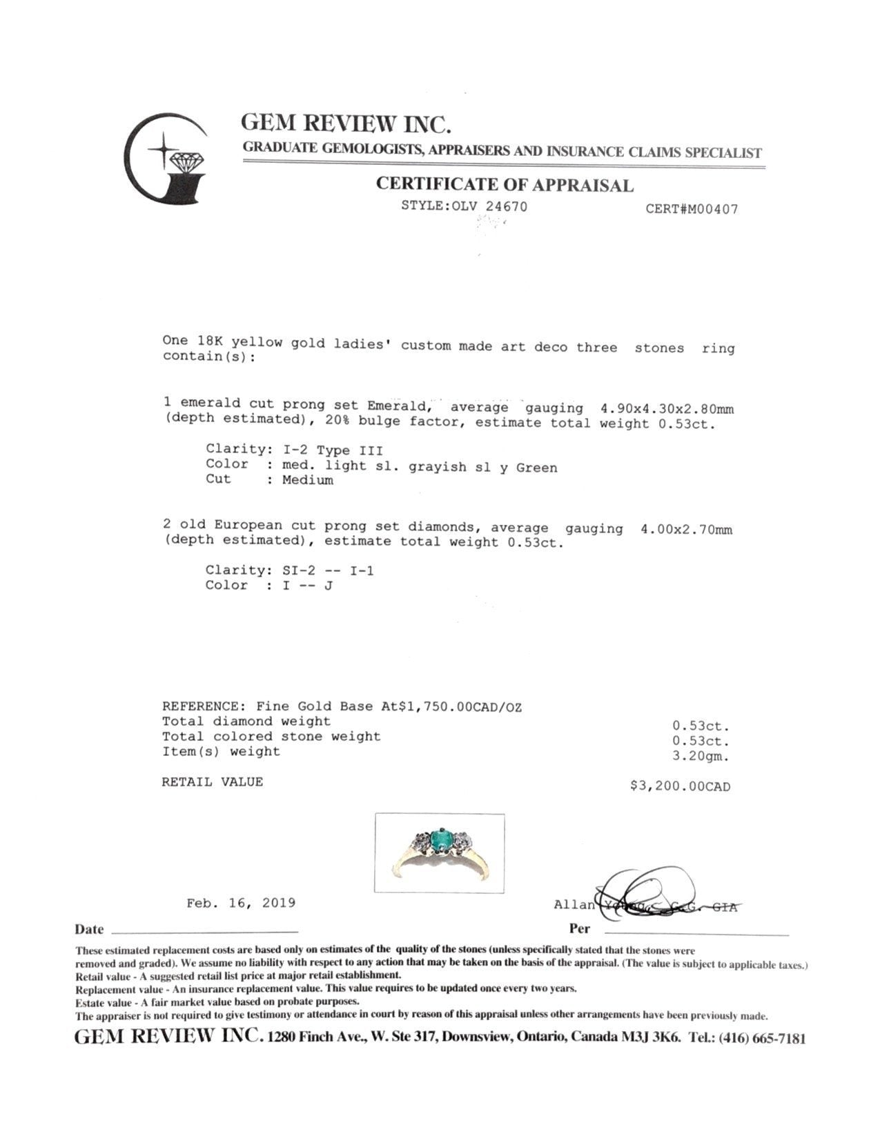 Antique Art Deco Emerald and Diamond Three Stone Ring
