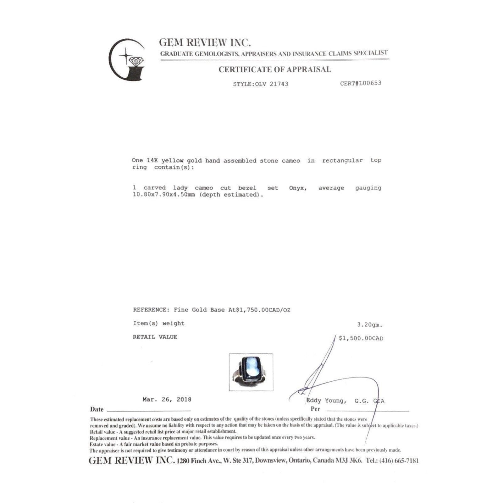 - 1 Carved Lady Cameo Cut Bezel Set Onyx (Estimated Average Gauging 10.80 mm x 7.90mm x 4.50mm)