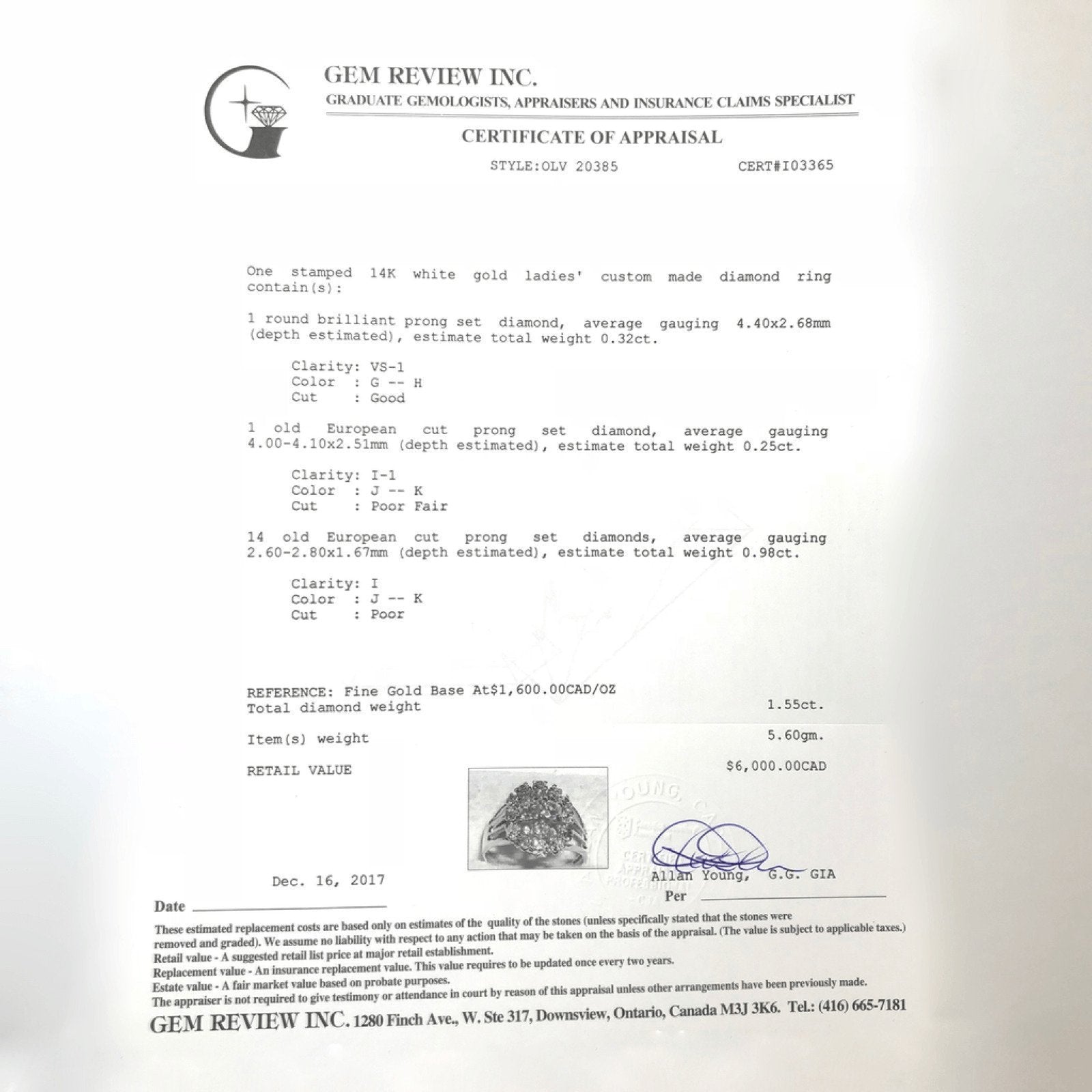 Antique Diamond Ring in 14kt White Gold; Approximately 1.55 Total Carat Weight; Size 8; Comes with $6,000 Gem Review Appraisal