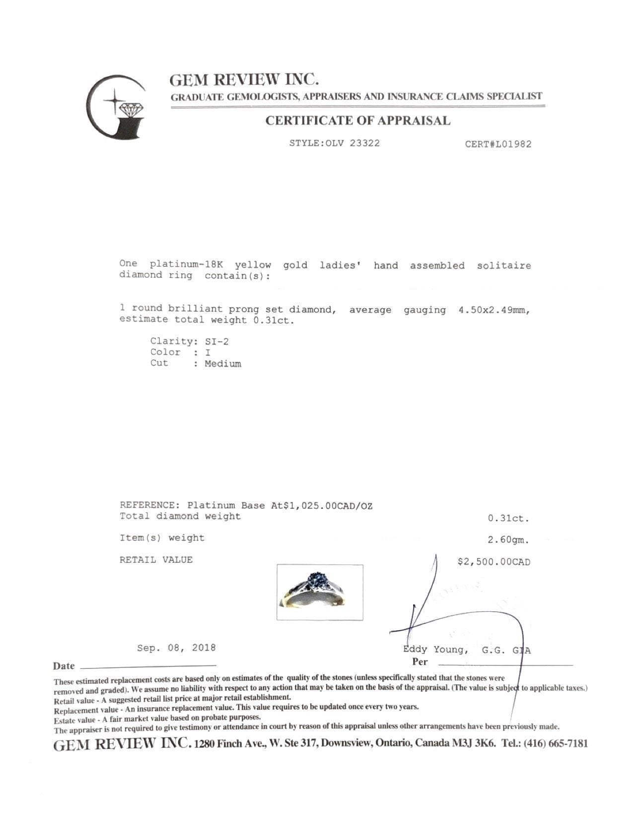 - 1 Round Brilliant Cut Diamond Weighing Approximately 0.31 ct. of SI2 Clarity, I Colour, Medium Cut