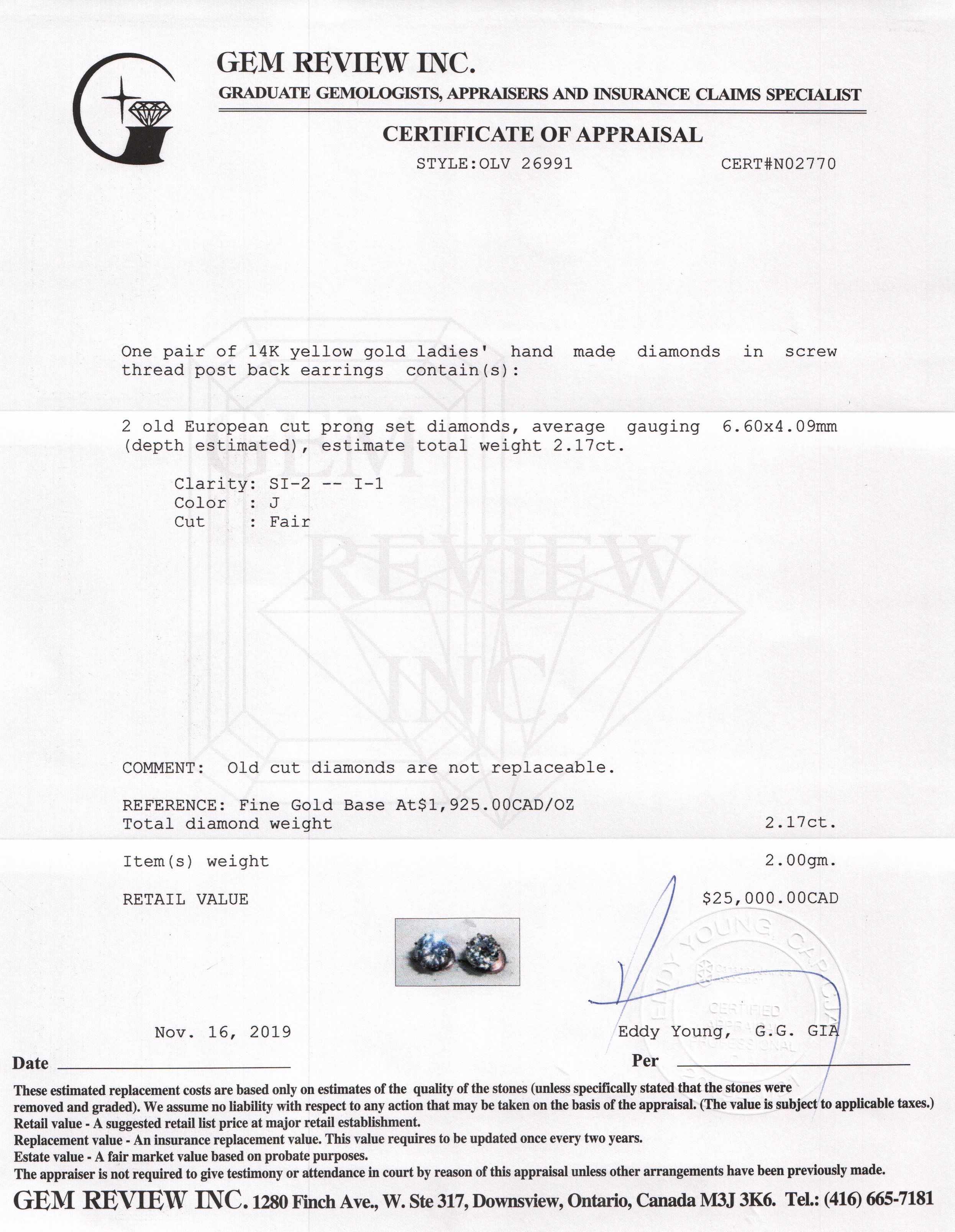 - 2 Old European Cut Diamonds Totalling Approximately 2.17 ct. of SI2-I1 Clarity, J Colour, Fair Cut
