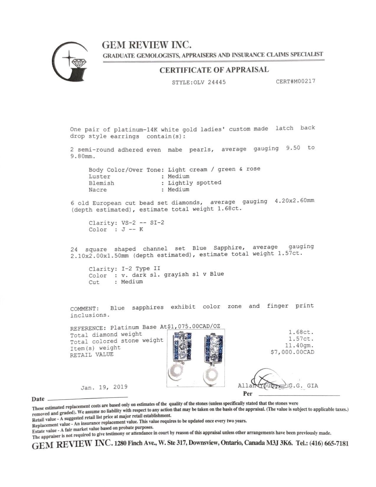 Antique Sapphire, Diamond, and Pearl Drop Earrings