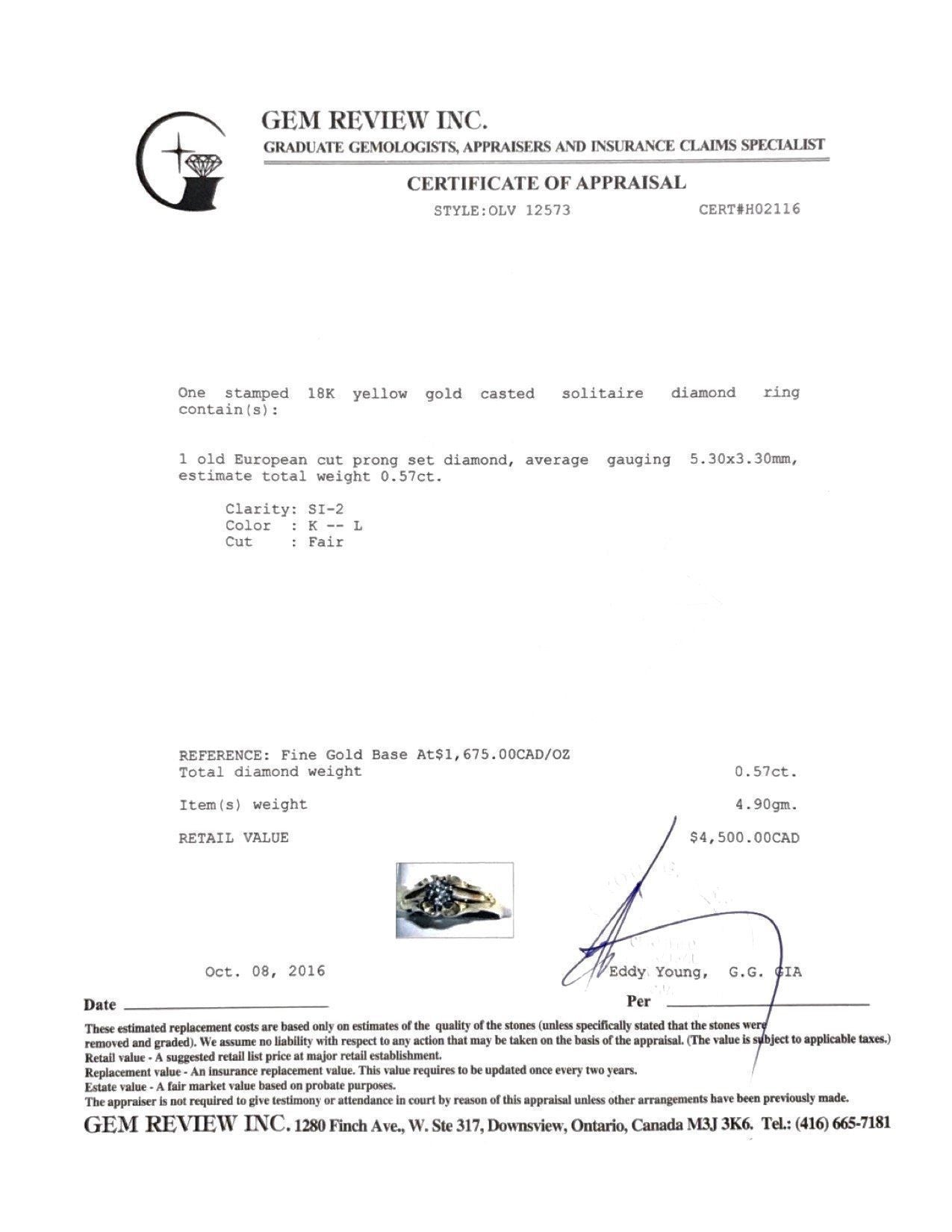 Antique Solitaire Diamond Ring in 18kt Yellow Gold; Contains 1 Old European Cut Diamond Weighing Approximately 0.57 ct. of SI2 Clarity, K-L Colour, Fair Cut; Size 8; Comes with $4,500 Gem Review Appraisal
