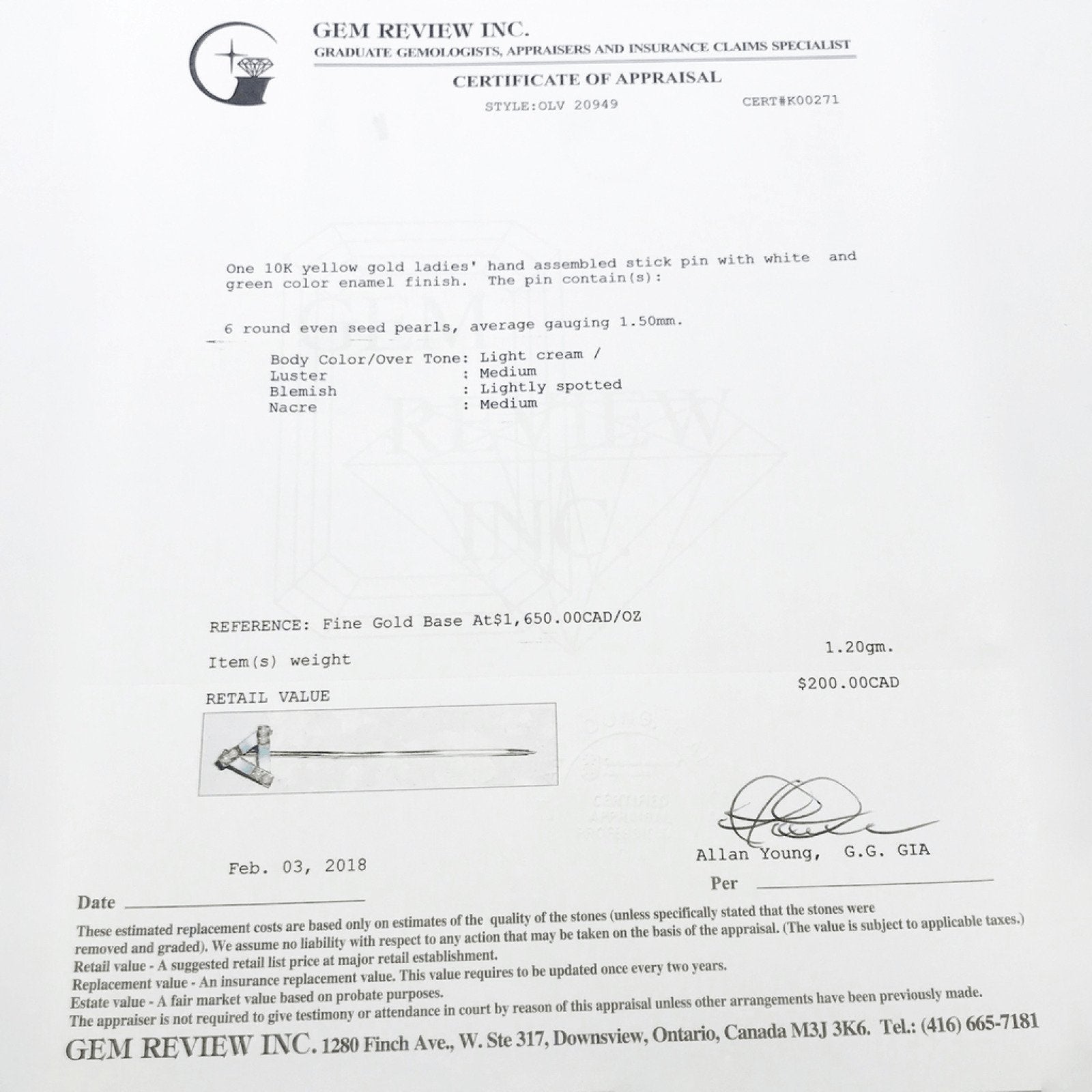 Antique Stick Pin with White and Green Color Enamel Finish and Six in 10K Yellow Gold , Comes with Gem Review Appraisal