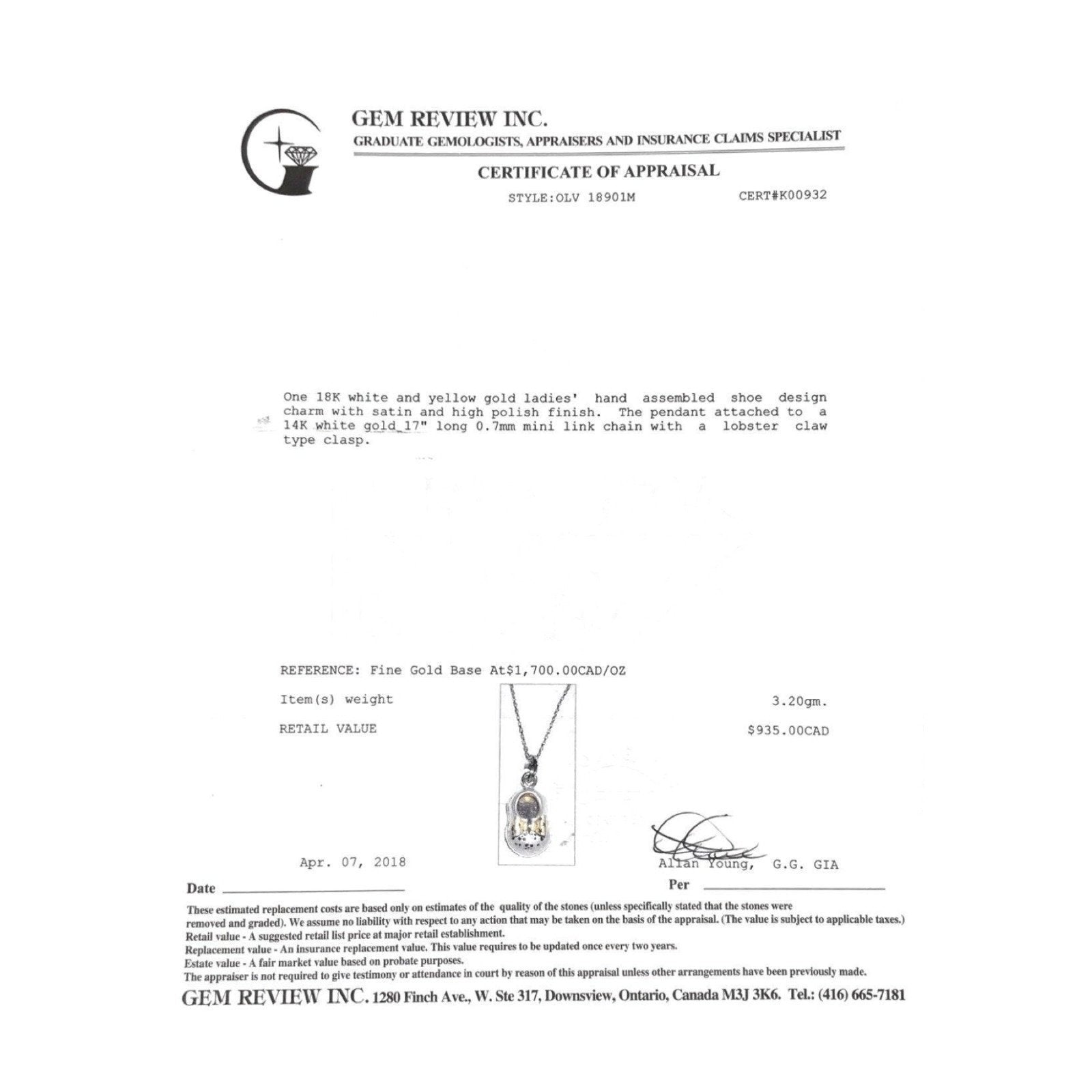 Baby Shoe Charm in 18kt White and Yellow Gold; Comes with $935 Gem Review Appraisal