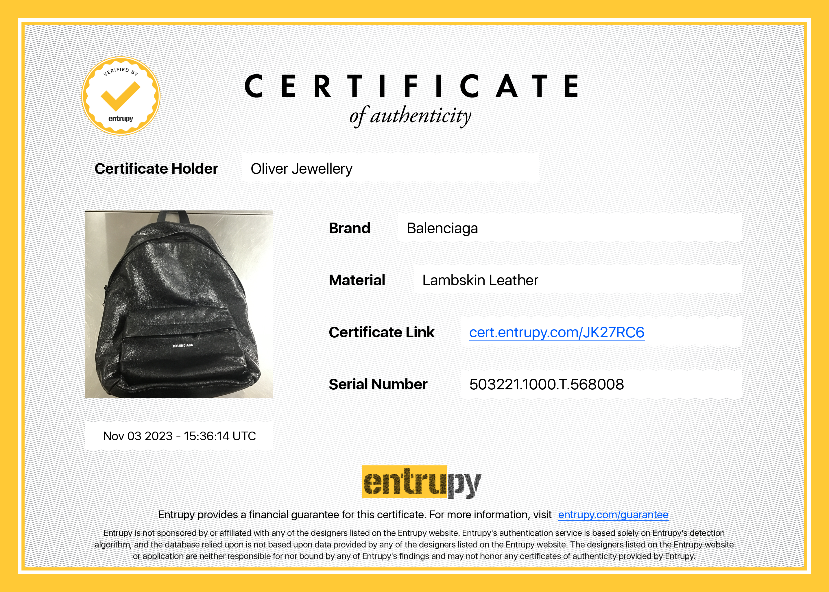 Entrupy Certificate of Authenticity