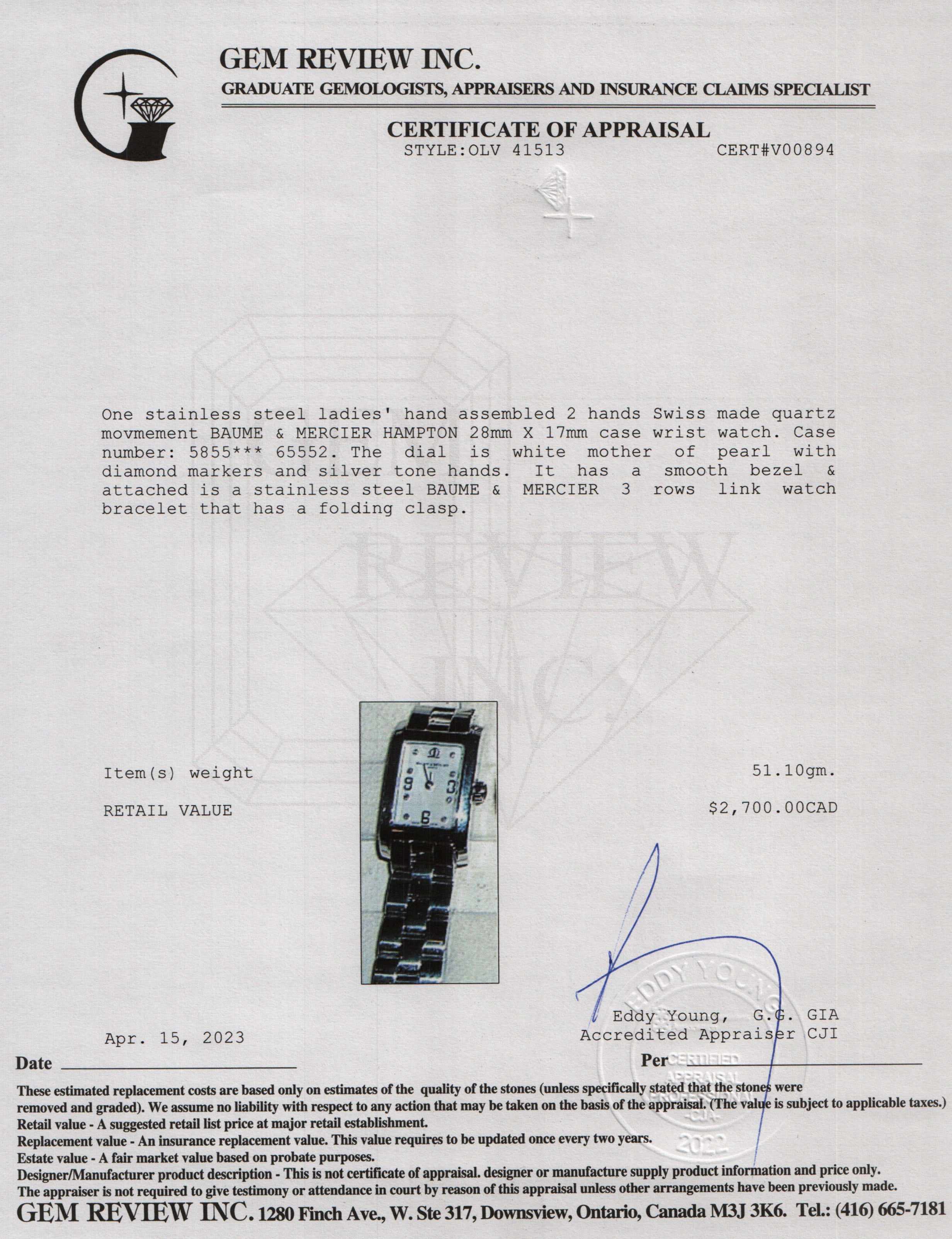 Included Items: Original Baume & Mericier Box, Booklet, Warranty Card and Gem Review Appraisal