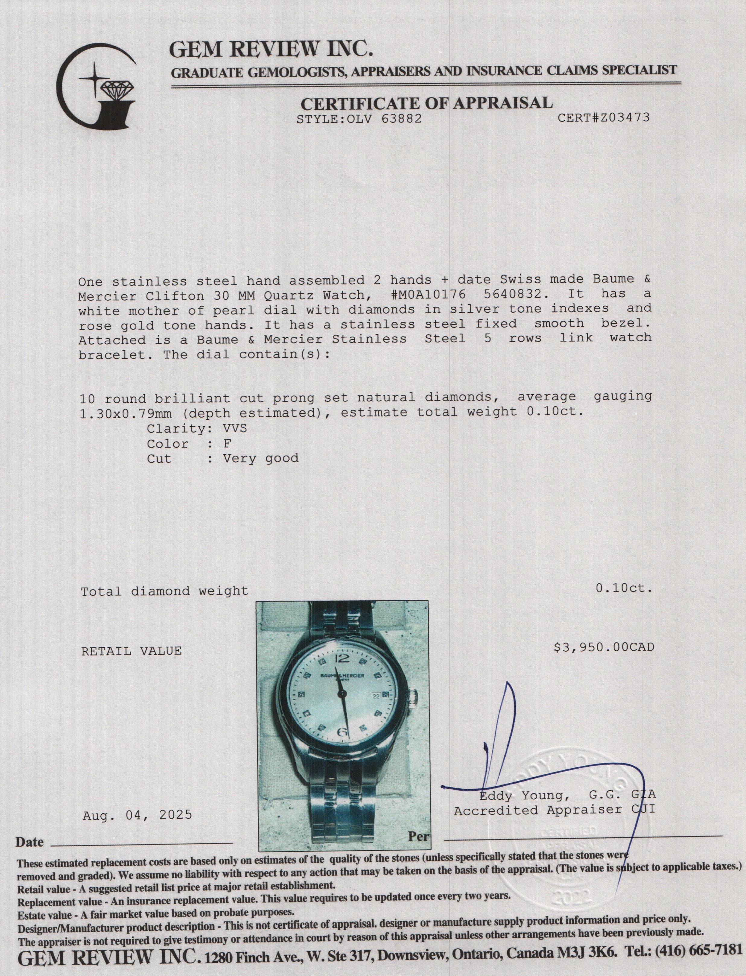 Stainless Steel Clifton 30 MM Quartz Watch Mother of Pearl Diamond Dial w/ Box