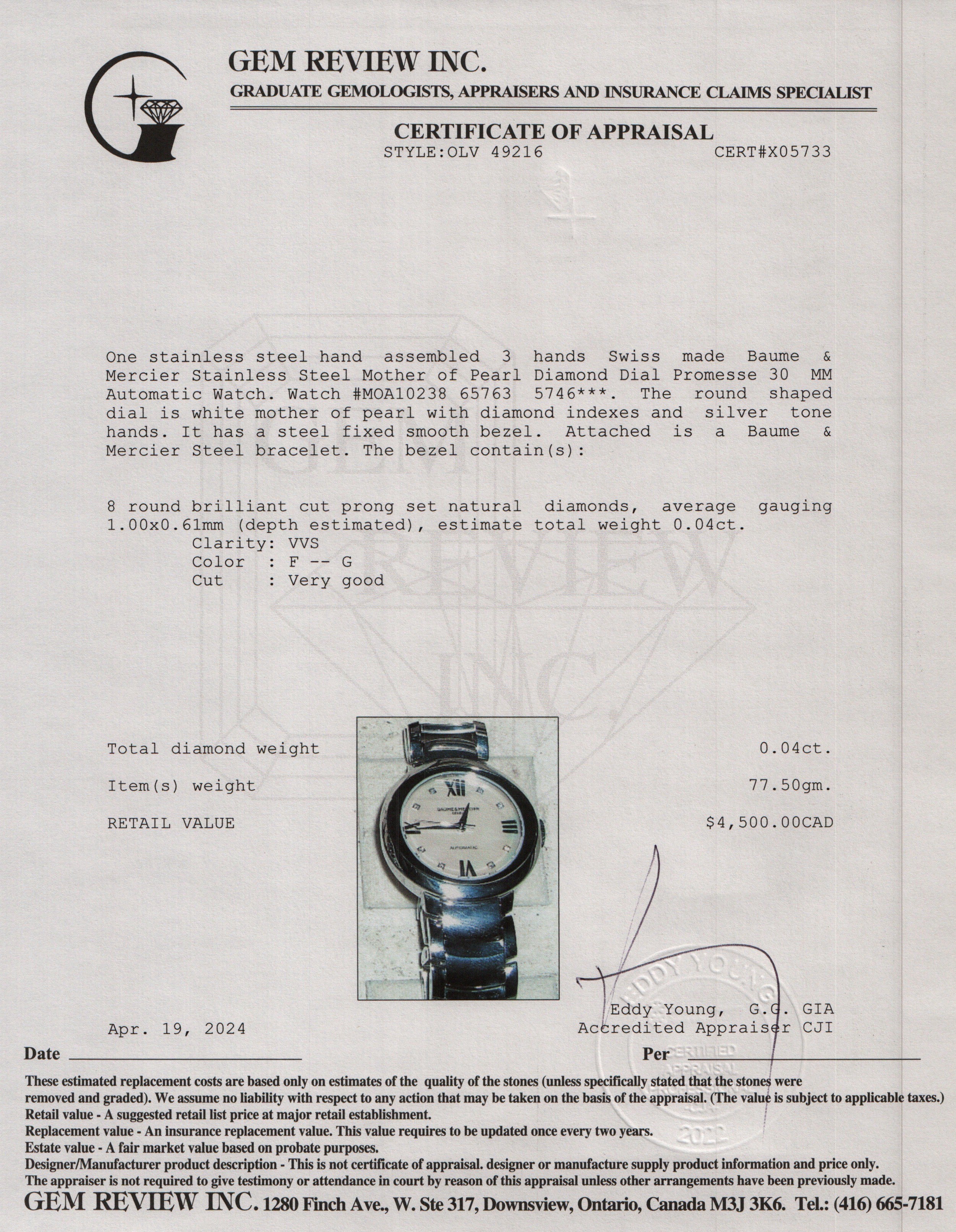 Stainless Steel Mother of Pearl Diamond Dial Promesse 30 MM Automatic Watch w/ Box & Papers