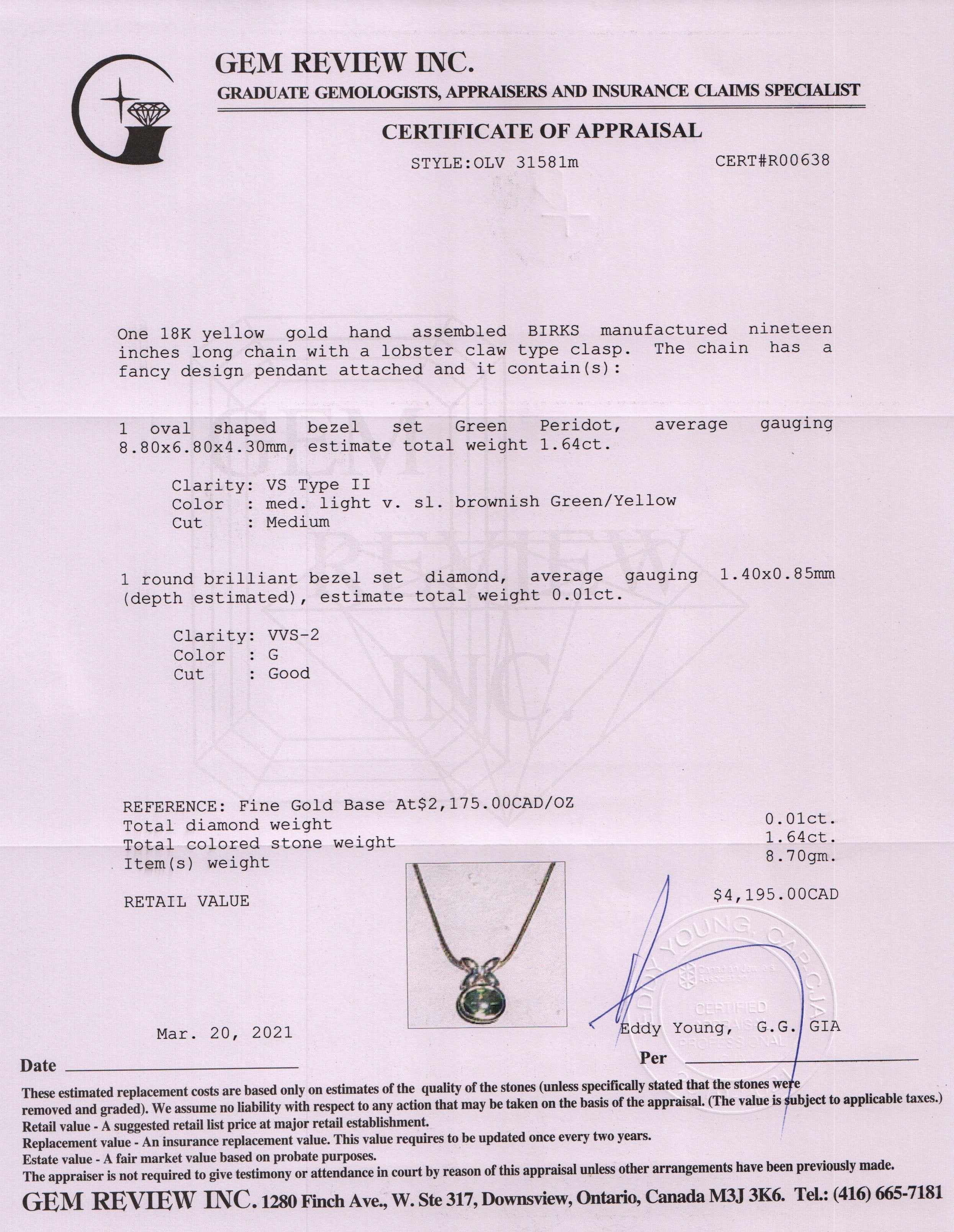Birks 18k Gold Peridot & Diamond Pendant Necklace