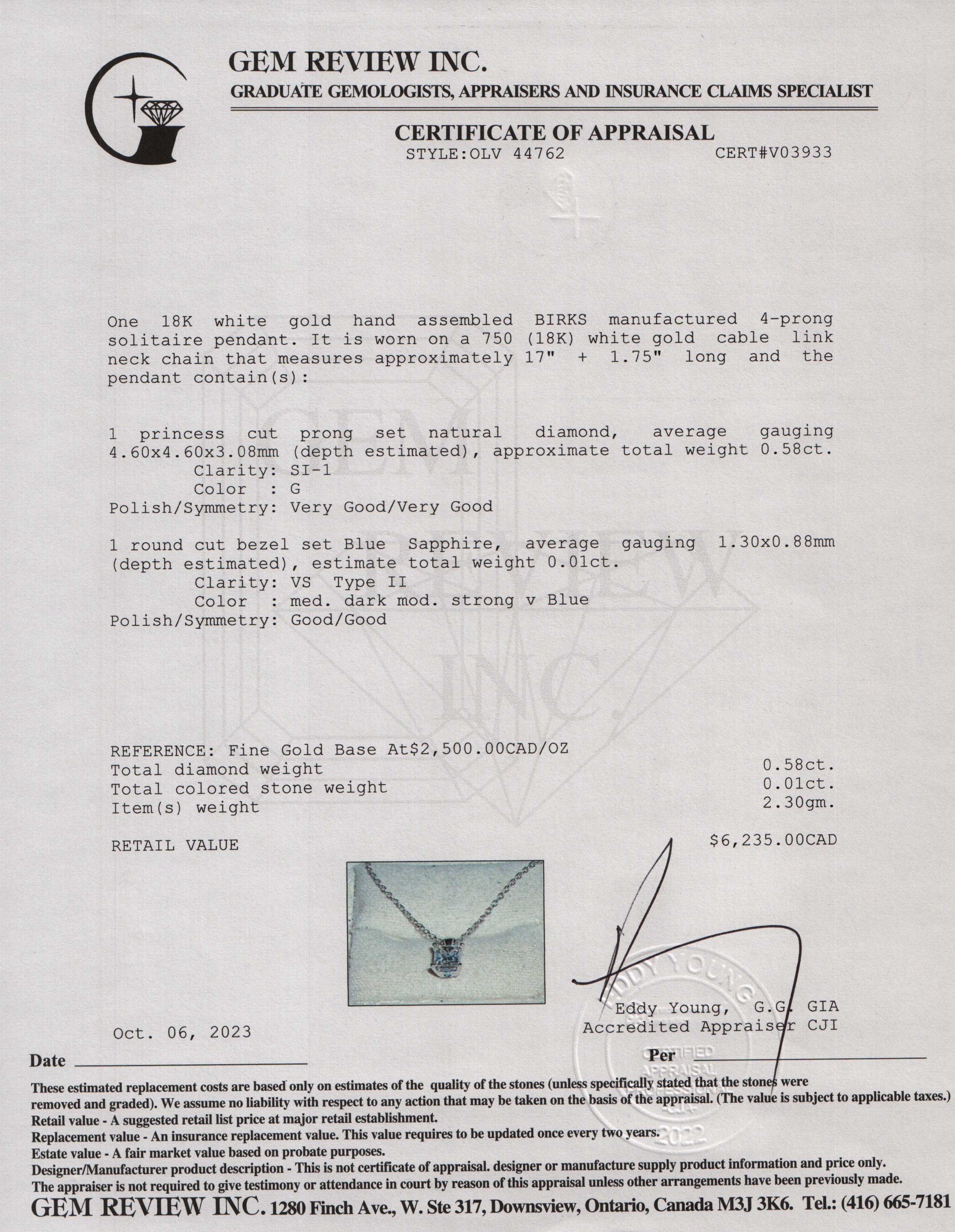 18k White Gold 0.58 ct. Princess Cut Diamond Pendant Necklace