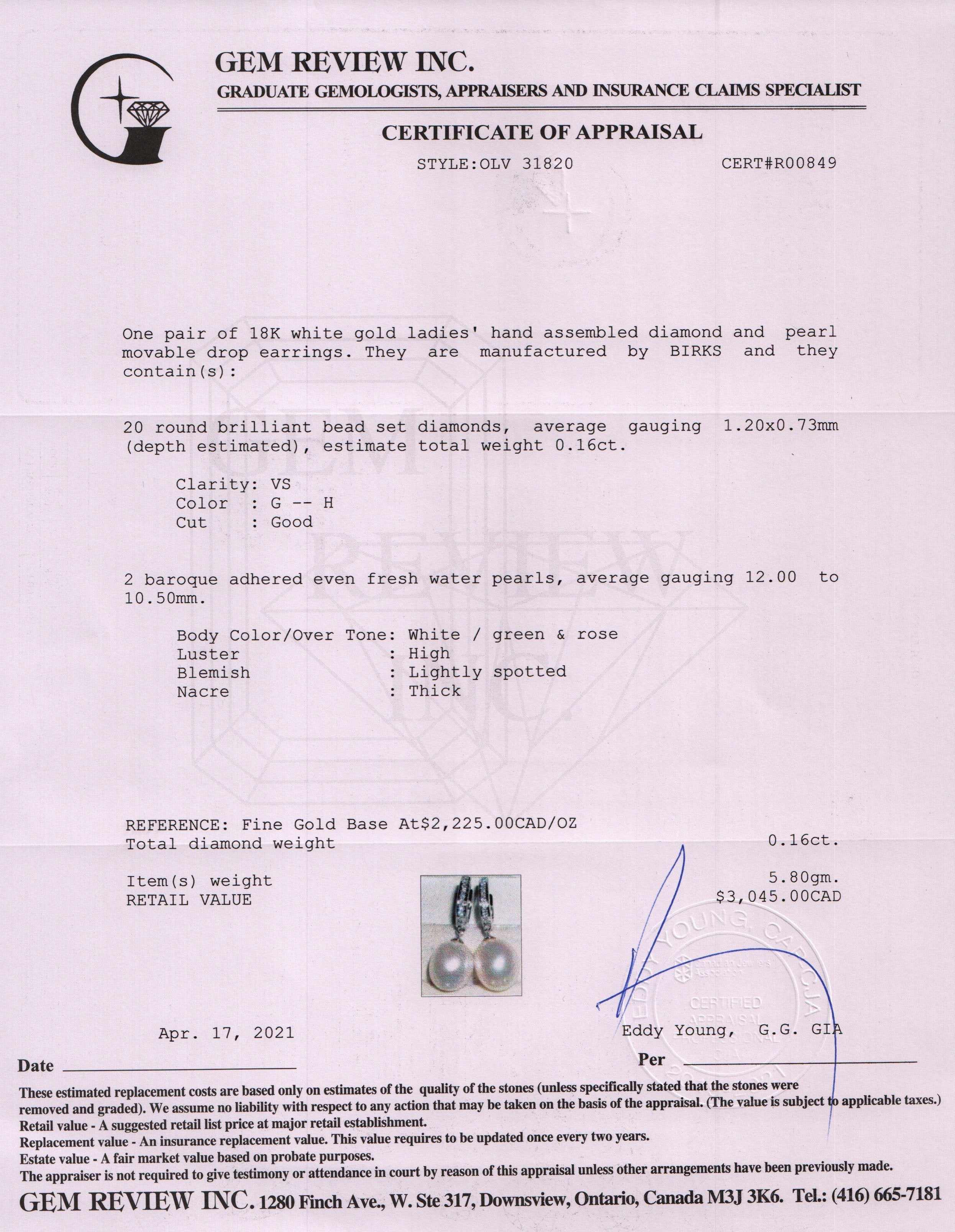 Birks 18k White Gold Pearl & Diamond Drop Earrings