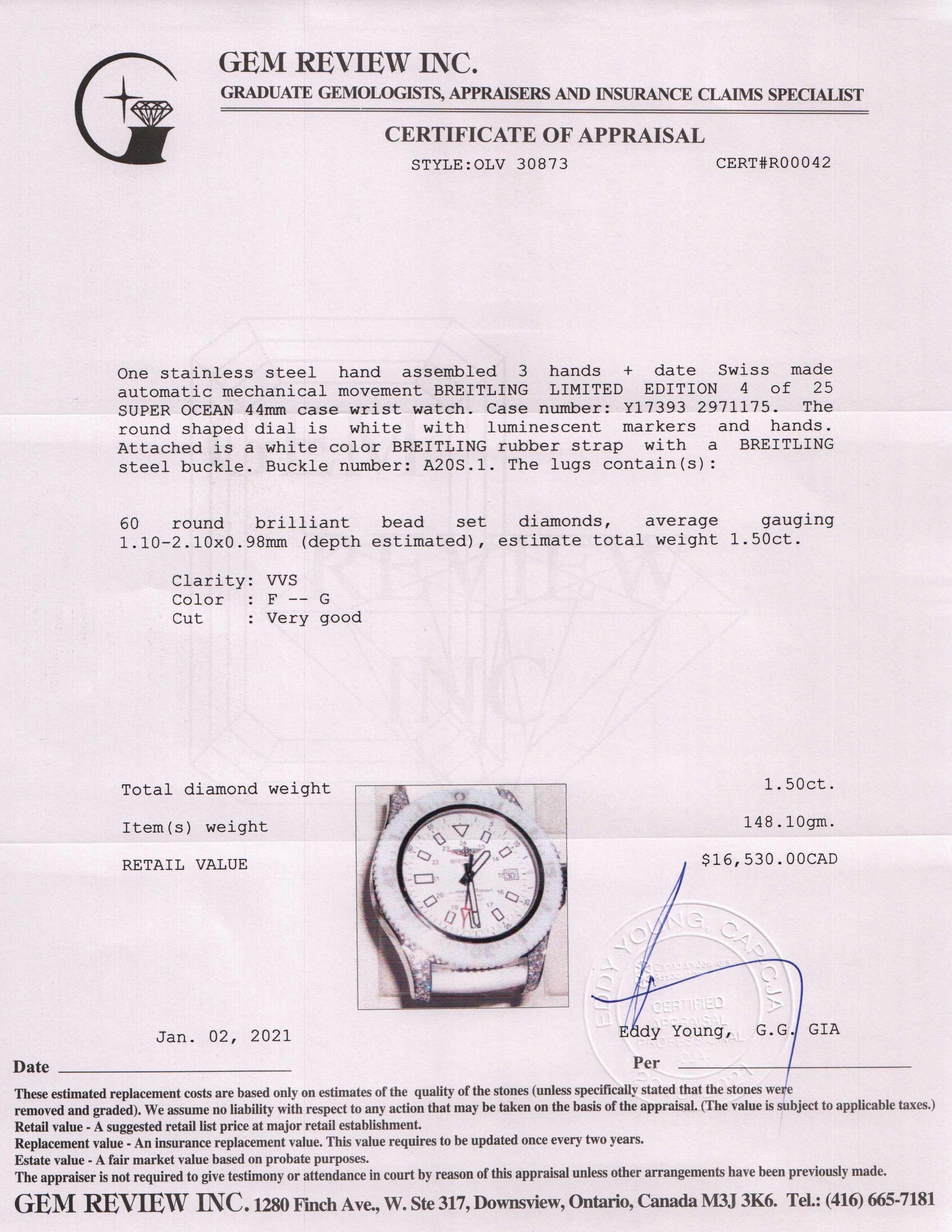 - Diamonds Lugs Contains 60 Round Brilliant Cut Diamonds Totalling Approximately 1.50 ct. of VVS Clarity, F-G Color, Very Good Cut